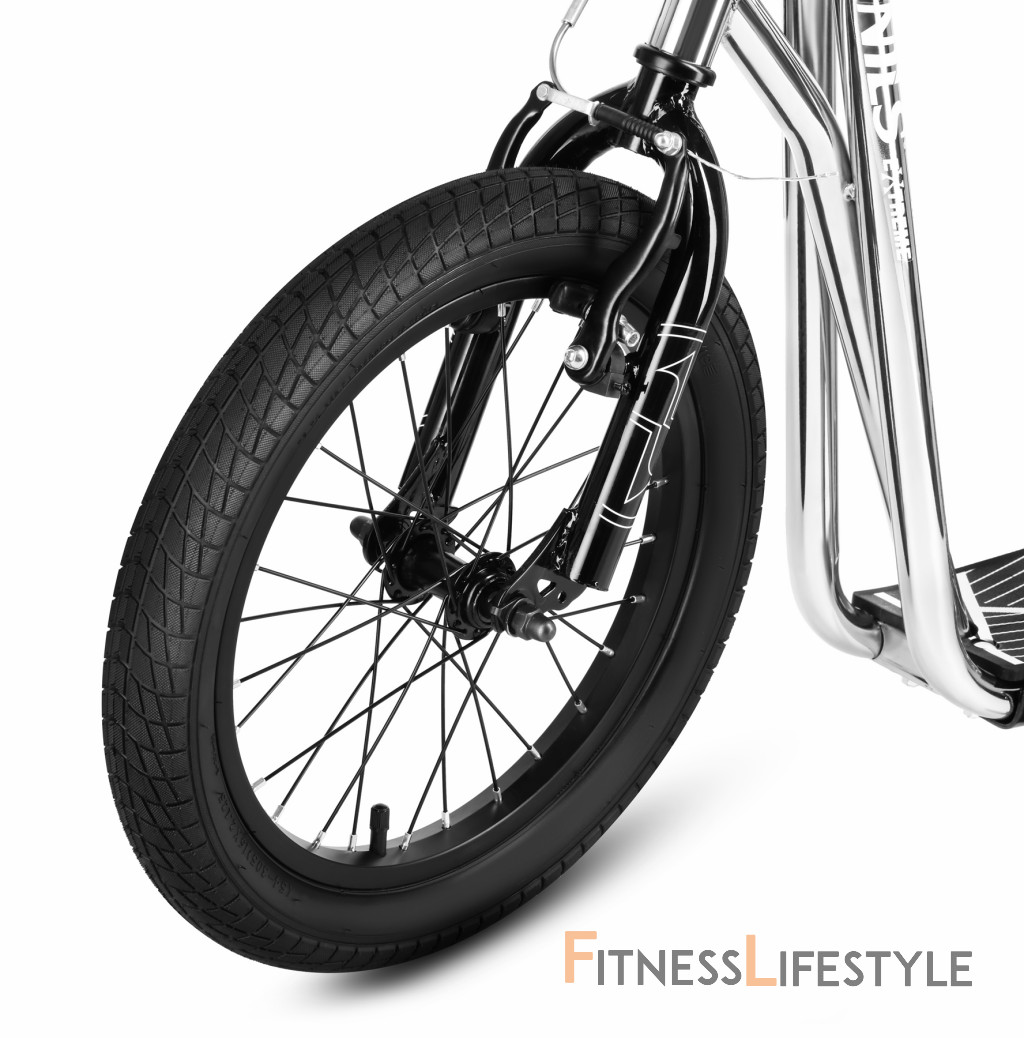 Jednou z najväčších výhod WH10121 sú veľké nafukovacie kolesá: 16 -palcové kolesá pred a 12 -palcami vzadu. Vďaka svojej veľkosti a konštrukcii ponúka skúter pohodlnú jazdu nielen na hladkom asfalte, ale aj na nerovnom chodníku, dláždených kameňoch alebo štrkových cestách. Tlmenie, ktoré ponúkajú pneumatiky účinne absorbuje nerovnomernosť, čo sa prejavuje väčším pohodlím a menším zaťažením kĺbov. Je ideálny pre tých, ktorí oceňujú hladkú jazdu a maximálnu kontrolu nad skútrom bez ohľadu na povrch.