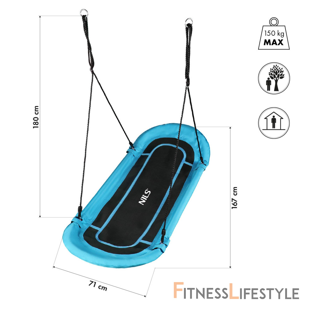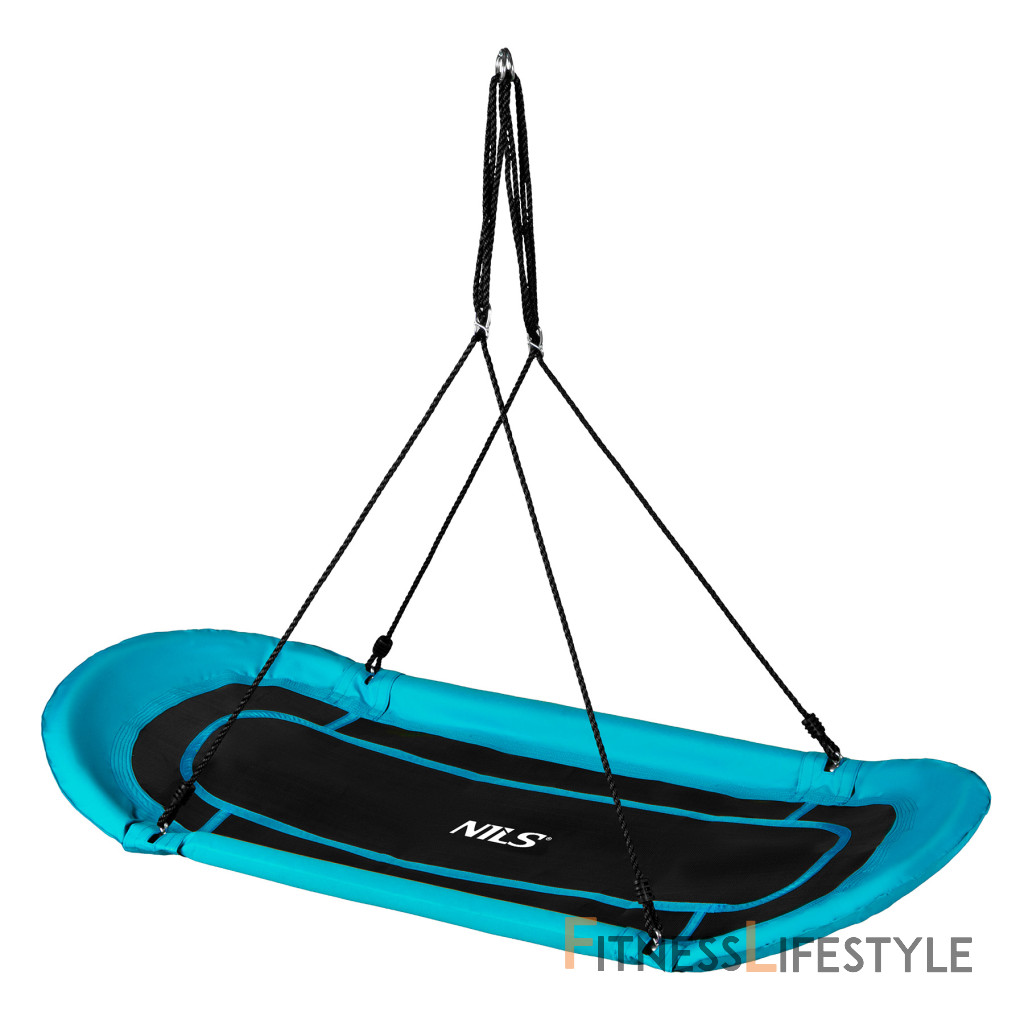 Na rozdiel od klasických výkyvov s okrúhlym sedadlom ponúka NB5044 oválny povrch 167 × 71 cm. Tento dizajn ponúka viac možností: Deti sa na ňom môžu pohodlne ľahnúť a môžu ho súčasne používať niekoľko ľudí. Vďaka pevnému oceľovému rámu s priemerom 25 mm a hrúbkou steny 1,4 mm zostáva hojdačka stabilná aj pri maximálnom zaťažení.