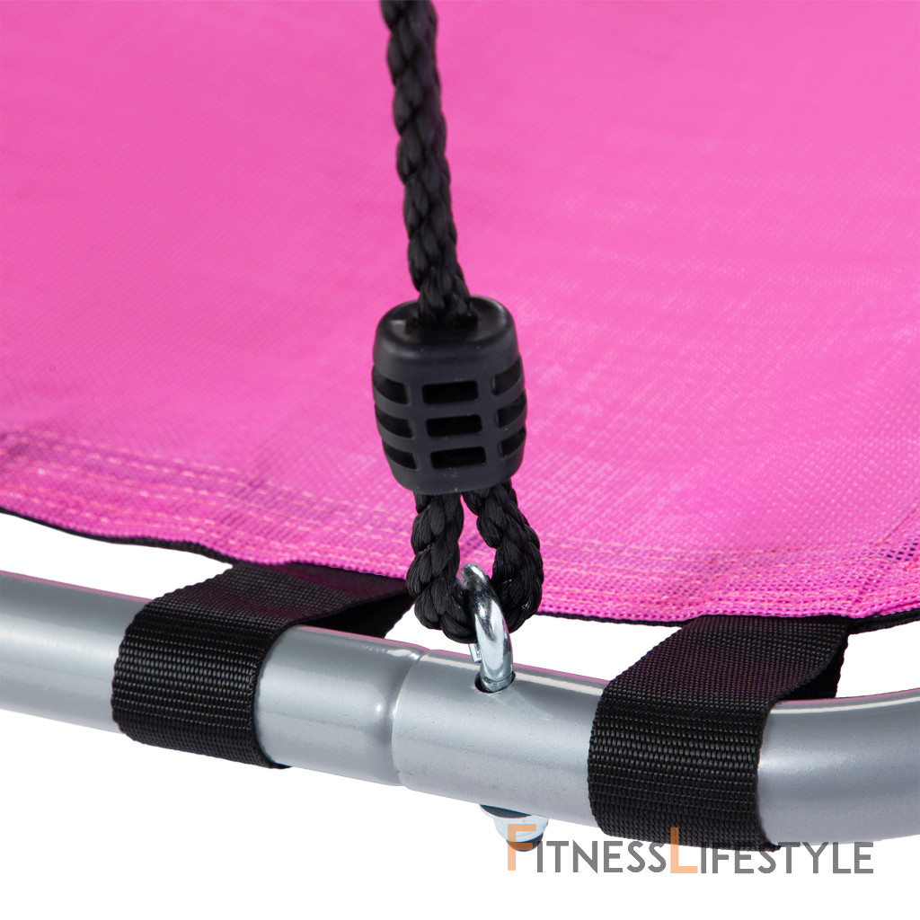 Rámje vyrobený z odolnej ocele s priemerom 25 mm a hrúbkou steny 1,4 mm, čo zaisťuje stabilitu a trvanlivosť celej konštrukcie. Lano s dĺžkou 180 cm a hrúbkou 1 cm umožňuje rýchlu montáž výkyvu na vetvách stromu, drevené lúče alebo iné konštrukčné prvky. Maximálna kapacita zaťaženia až 150 kg zaisťuje bezpečné použitie pre deti a dospelých.