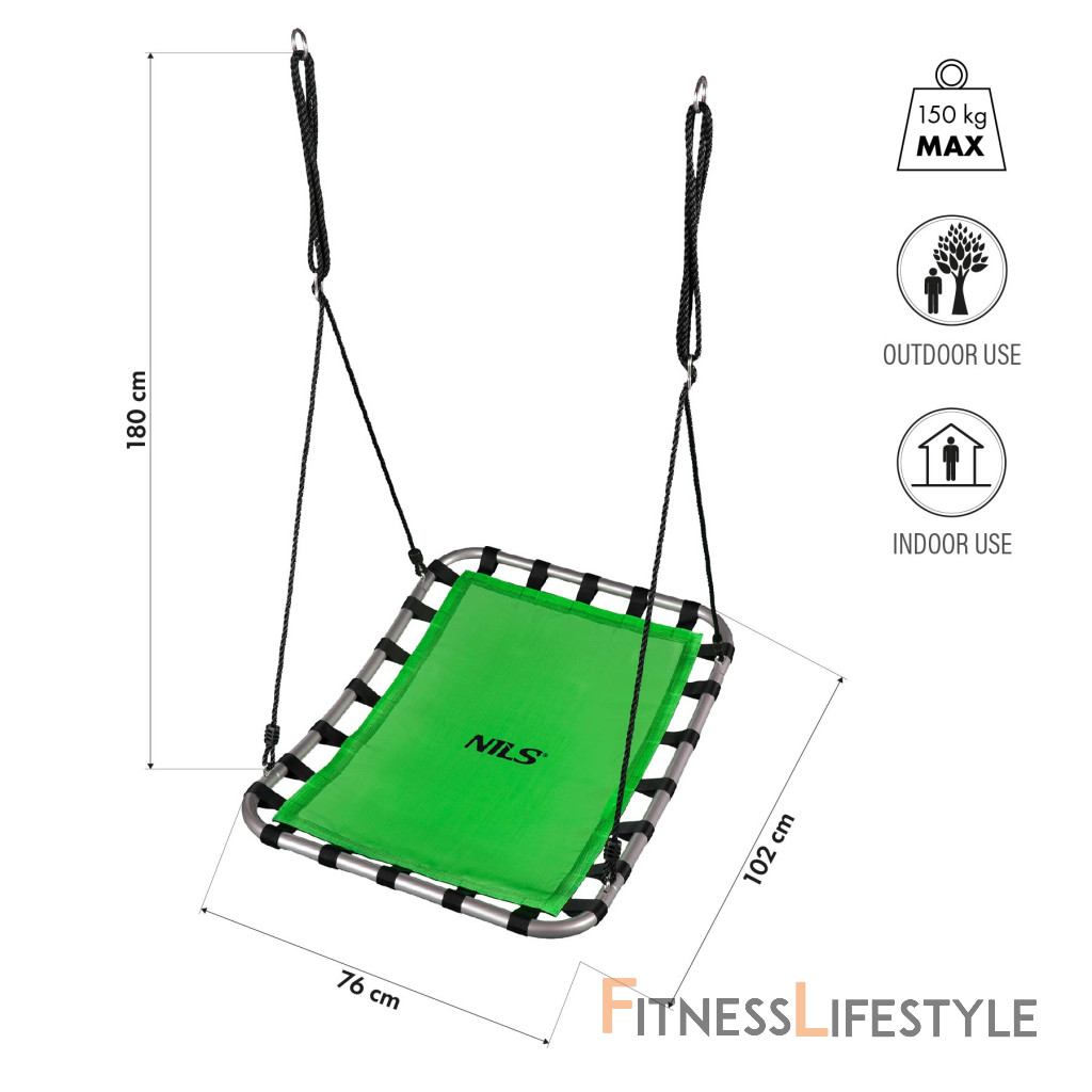 Rámje vyrobený z odolnej ocele s priemerom 25 mm a hrúbkou steny 1,4 mm, čo zaisťuje stabilitu a trvanlivosť celej konštrukcie. Lano s dĺžkou 180 cm a hrúbkou 1 cm umožňuje rýchlu montáž výkyvu na vetvách stromu, drevené lúče alebo iné konštrukčné prvky. Maximálna kapacita zaťaženia až 150 kg zaisťuje bezpečné použitie pre deti a dospelých.