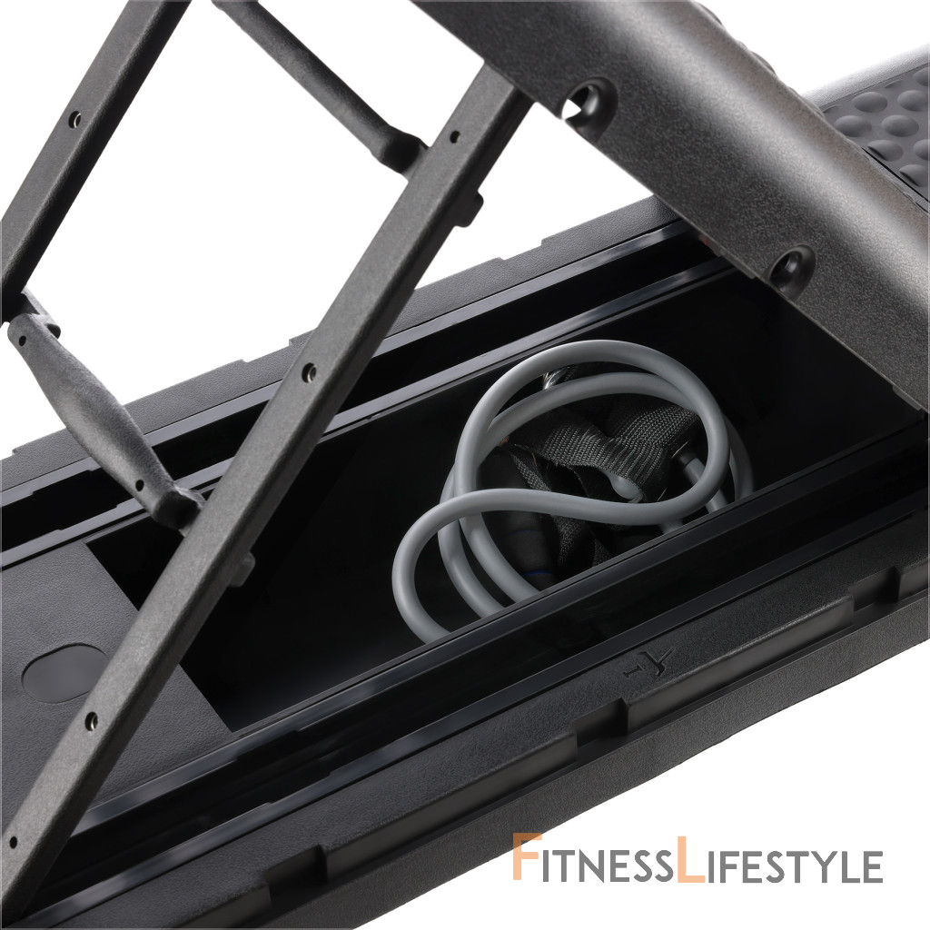 Most má vstavaný priestor na ukladanie malých príslušenstiev, ako je guma, opasky alebo lano preskočenia, takže vždy budete mať k dispozícii všetky potrebné vybavenie. Súbor navyše obsahuje aj expandéry, ktoré umožňujú silový tréning bez potreby siahajúcich po ďalších váhach.