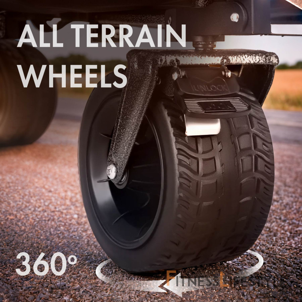 Telo invalidného vozíka je vyrobené z polyesteru v 600D Oxforde, ktorý je odolný voči oderu a vlhkosti. Materiál vydrží intenzívne použitie a ľahko sa udržiava čistý, čo z neho robí ideálnu voľbu pre outdoorové aktivity.veľké kolesá pre každý terén