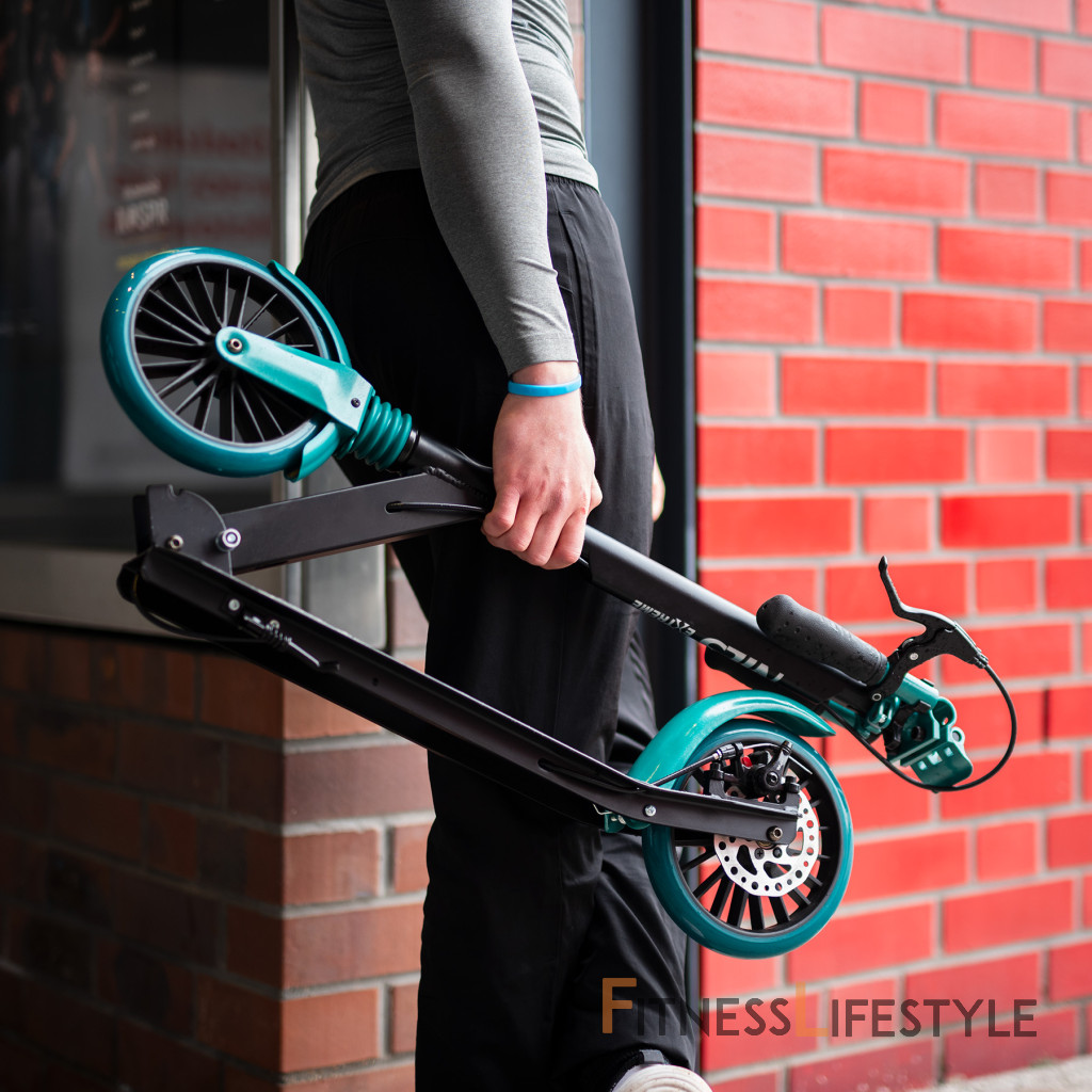 Vďaka jednoduchému skladaciemu mechanizmu je možné skúter rýchlo a ľahko zložiť do kompaktnej veľkosti 78 x 34 x 14 cm. Je to skvelé riešenie pre skladovanie alebo dopravu, napríklad vo verejnej doprave alebo kufre automobilu. Integrovaný stojan umožňuje pohodlné odstavenie skútra bez toho, aby sa oprel o stenu.