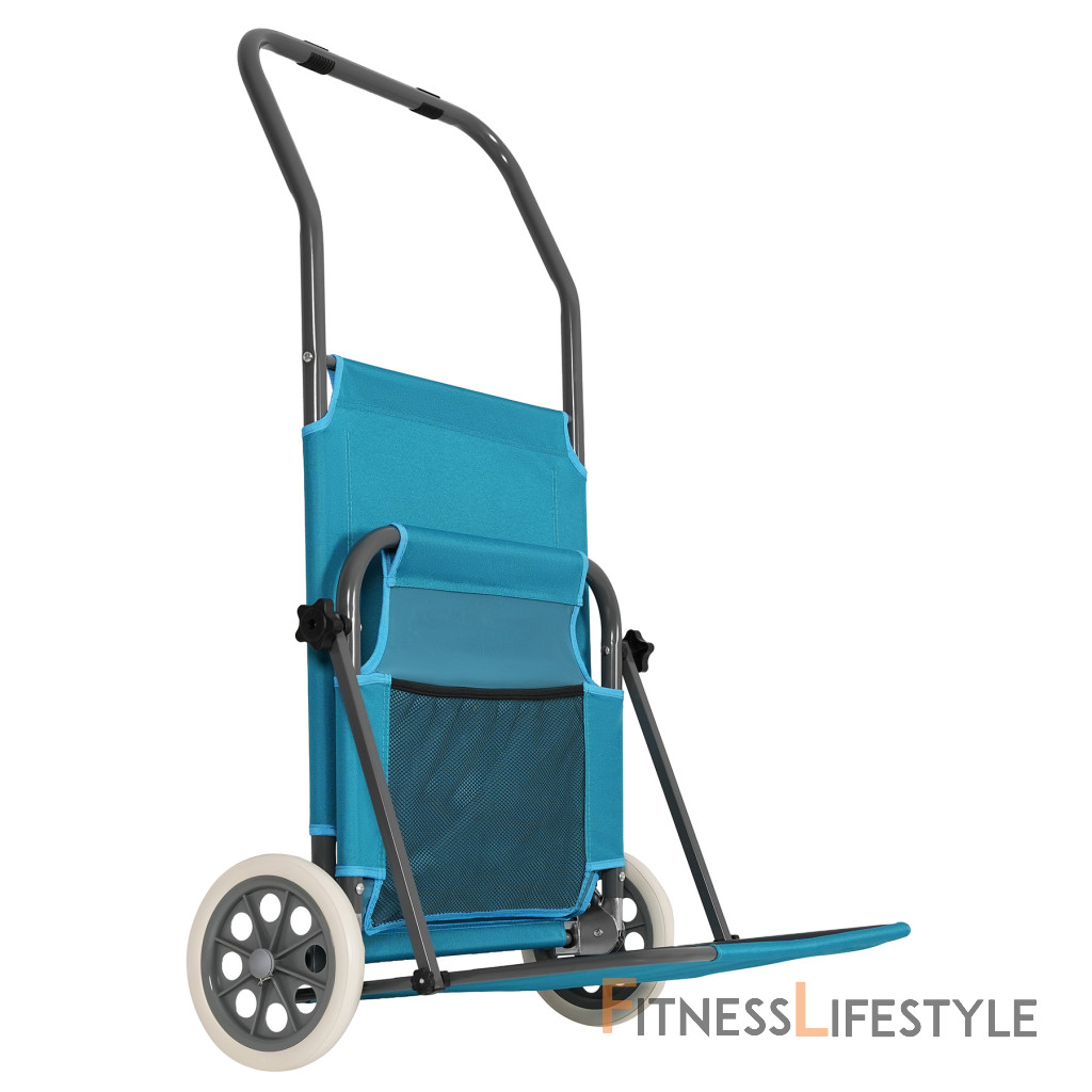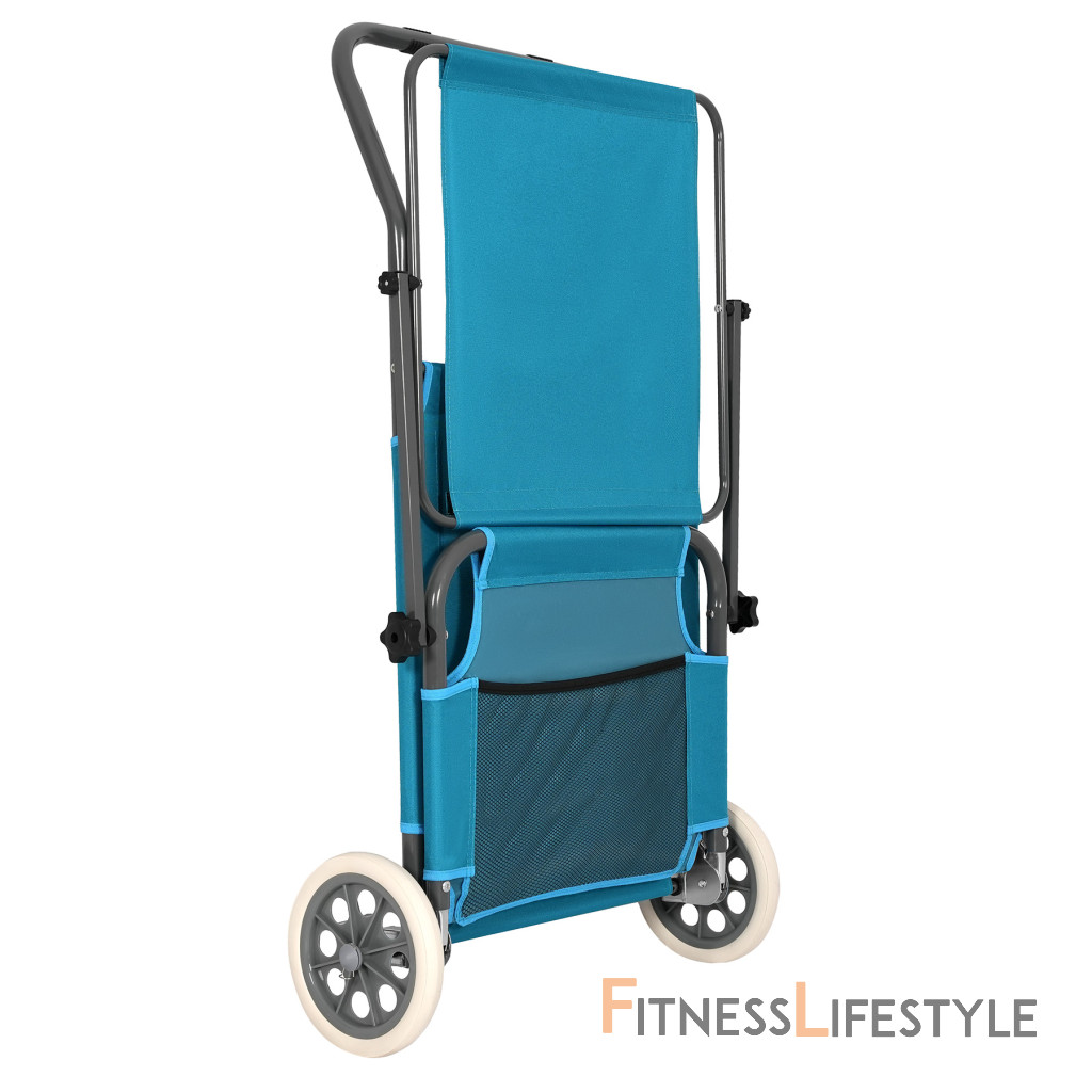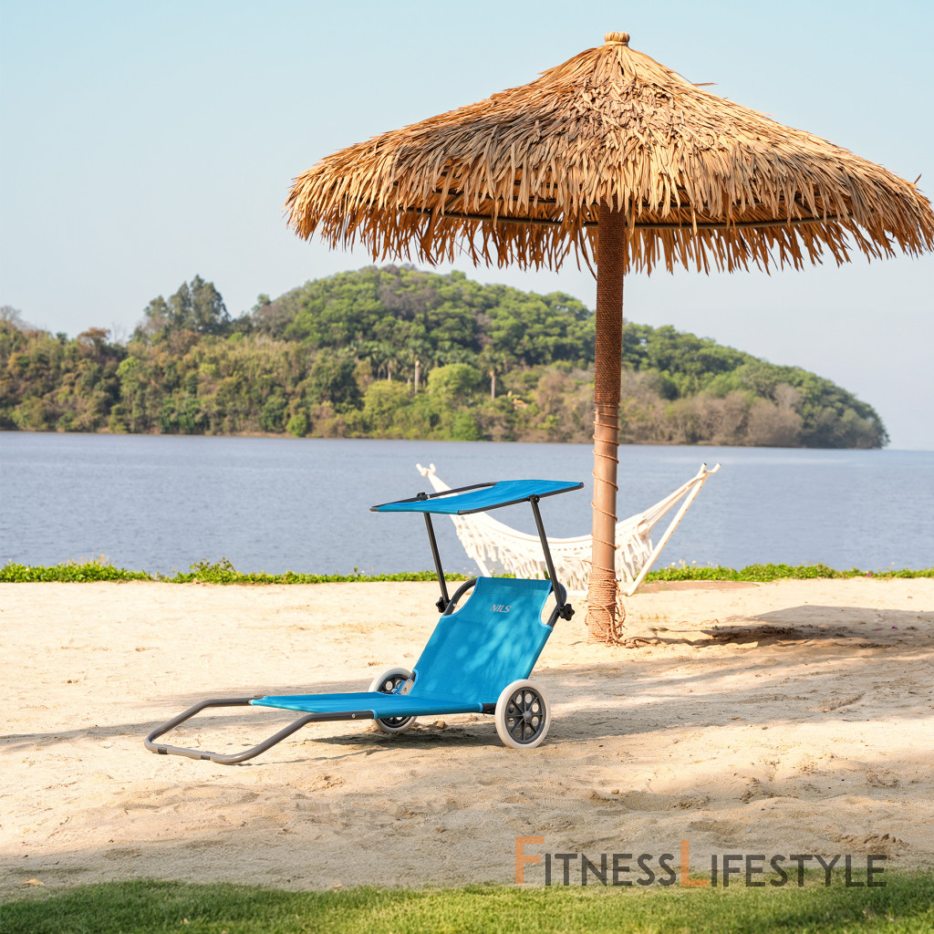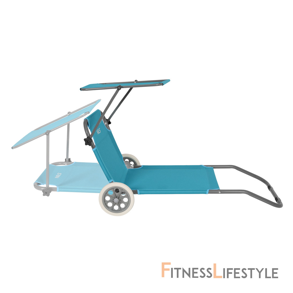 Na zadnej strane konštrukcie sú dva prepravné kolesá, ktoré výrazne uľahčujú pohyb slnečných ležadiel. Stačí zdvihnúť prednú časť a viesť ho ako kufor - bez zdvíhania alebo demontáže. Je to užitočné najmä na pláži, v tábore alebo v prípade, že potrebujete rýchlo presunúť ležadlá na slnečné alebo zatienené miesto.