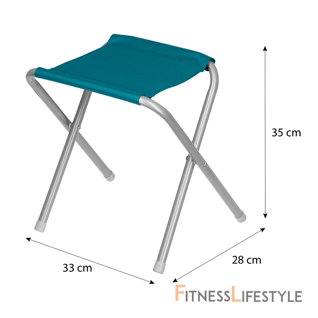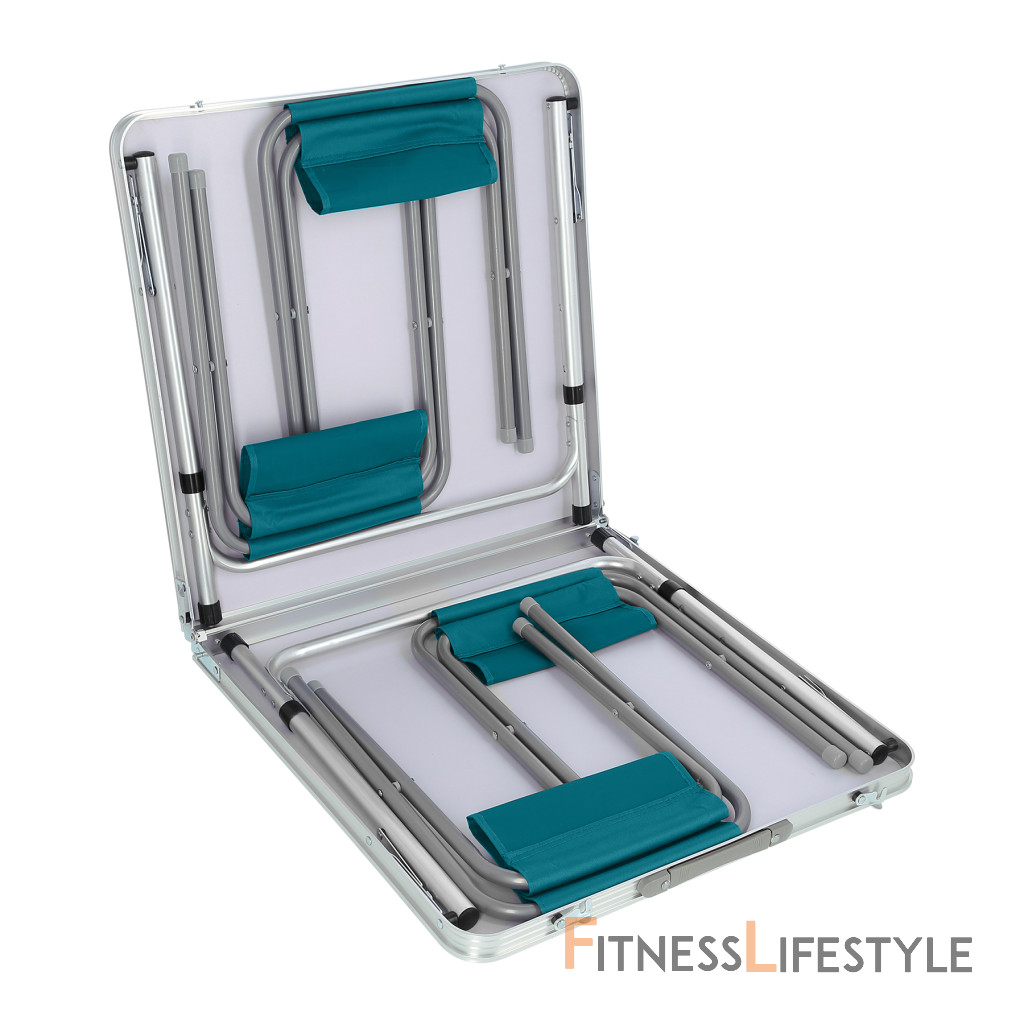 Štyri stoličky majú hliníkový rám a vankúše vyrobené z odolného polyesteru. Po usporiadaní má každá stolička výšku 35 cm a oblasť sedadla je 27 x 25 cm. Po skladaní sú stoličky uložené v zloženom stole (aktovka), ktorá ukladá priestor a robí celý nastavený veľmi kompaktný celok.
