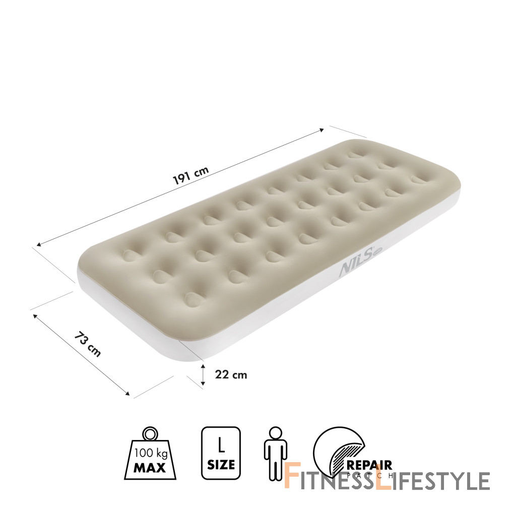 Matrace je vyrobené z pevného PVC, odolného voči oderu, roztrhnutiu a ľahko. Vnútorná štruktúra podporuje rovnomerné rozdelenie telesnej hmotnosti, ktorá prispieva k pohodlnému spánku a odpočinku. Materiál nenechá vzduch udržiavať matrac so správnym tlakom bez potreby častého umenia. Okrem toho je zosilnená spodná časť matraca, čo zlepšuje jeho odpor aj na nerovnomerných povrchoch.