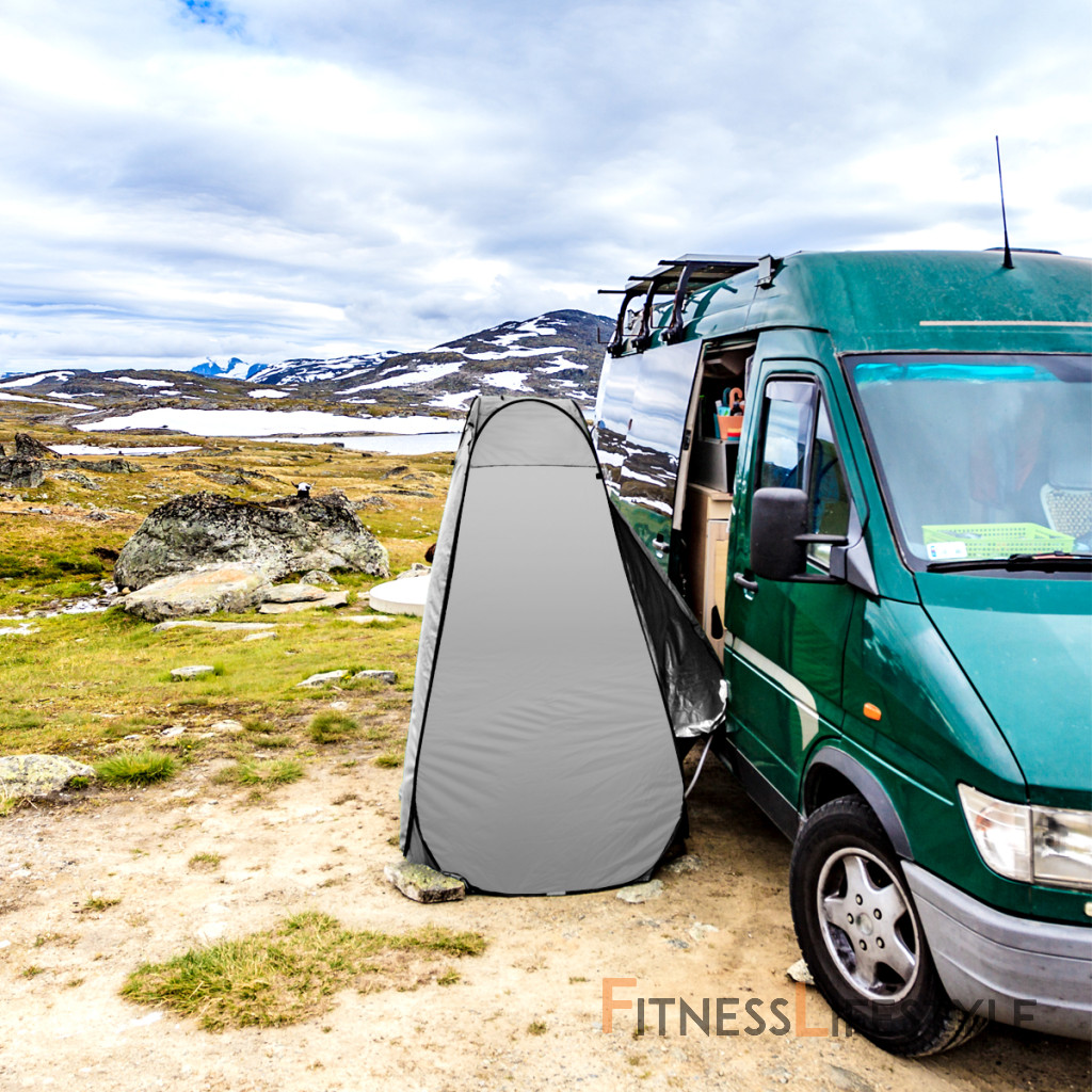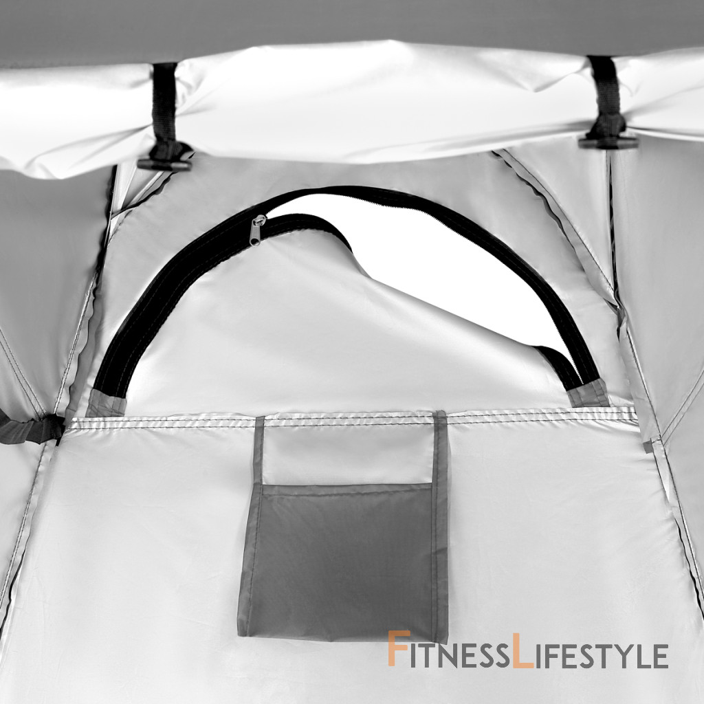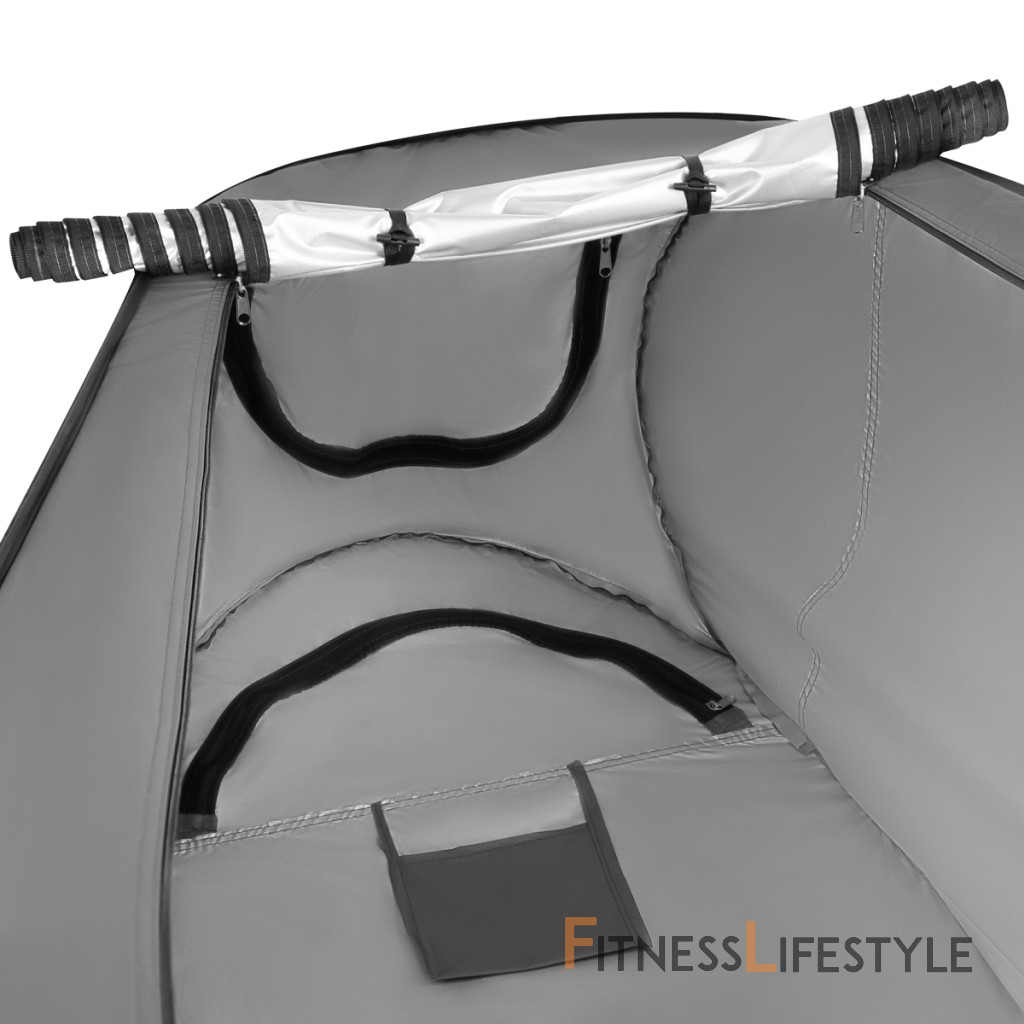 Vonkajšia vrstva je vyrobená z odolného polyesteru s vodotesným povlakom, ktorý chráni pred dažďom a vlhkosťou. Vo vnútri sa aplikuje strieborná izolačná vrstva, aby sa zabránilo prehrievaniu kabíny zo slnečných lúčov. Materiál je plne pokrytý a nepriehľadný, takže použitie šatne zaručuje pohodlie a uváženie.