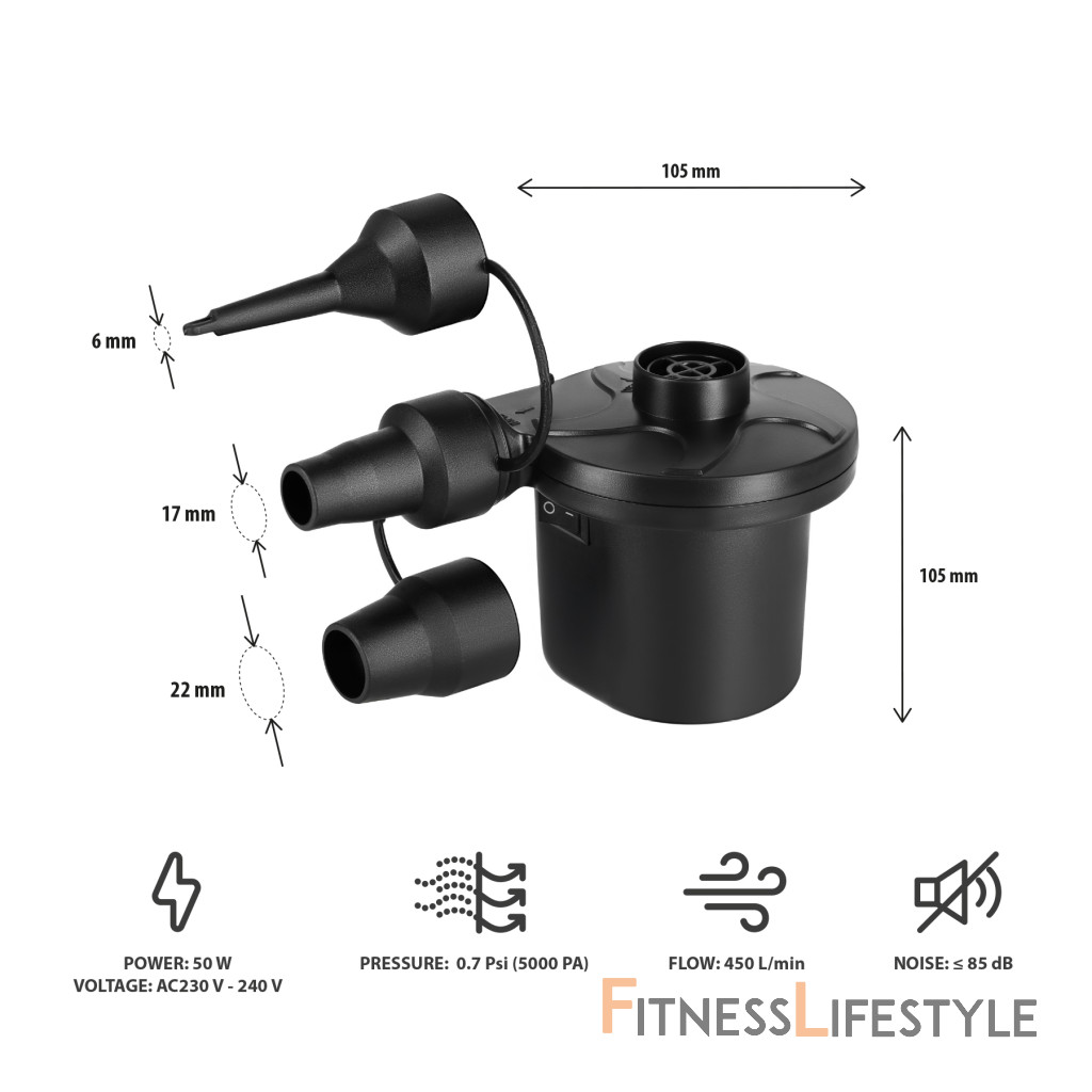 Zariadeniedosahuje 450 litrov za minútu, čo umožňuje rýchlu infláciu blesku a väčšie nafukovacie príslušenstvo. Pracovný tlak do 5 kPa zaisťuje správnu tvrdosť nafúknutých objektov a maximálny hluk nepresahuje 85 dB, čo robí čerpadlo pohodlné pre každodenné použitie. Čerpadlo sa dá použiť aj na vyfúknutie.