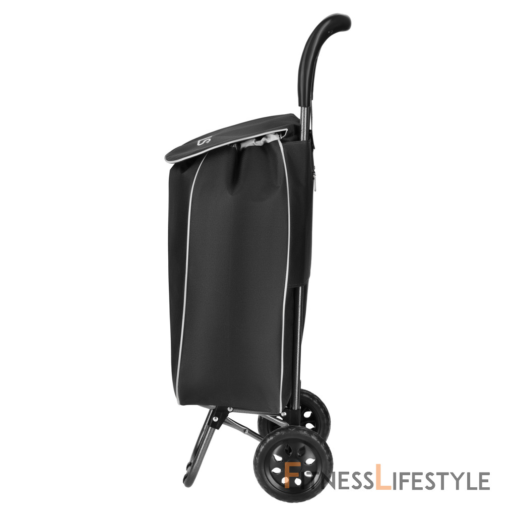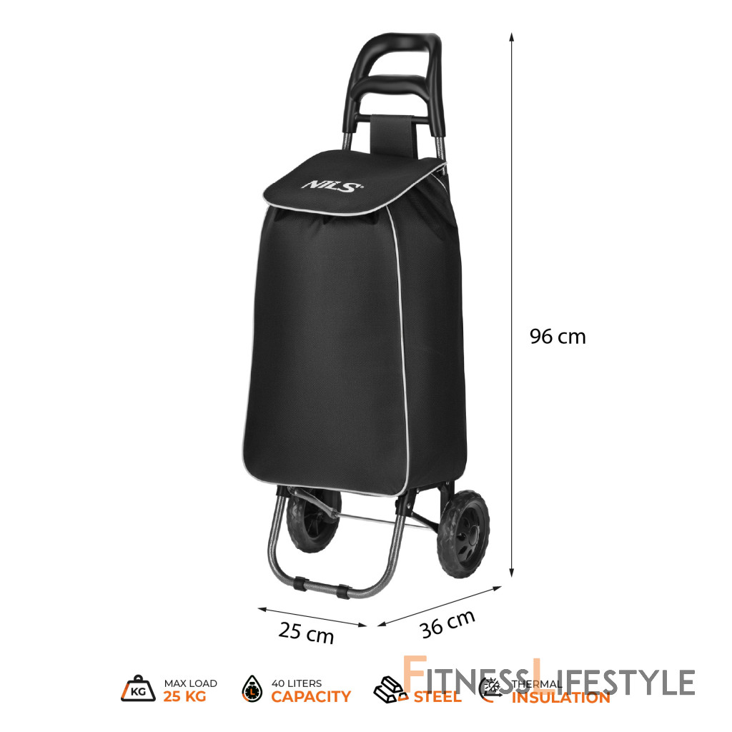 Vozík je vybavený pevným oceľovým rámom, ktorý zaisťuje odolnosť a stabilitu aj pri plnom zaťažení. Hlavná komora je vyrobená z odolného polyesteru 600D Oxford s vysokou odolnosťou proti vlhkosti a nečistotám. Jeho objem je približne 40 litrov, čo umožňuje uskladnenie veľkého nákupu.