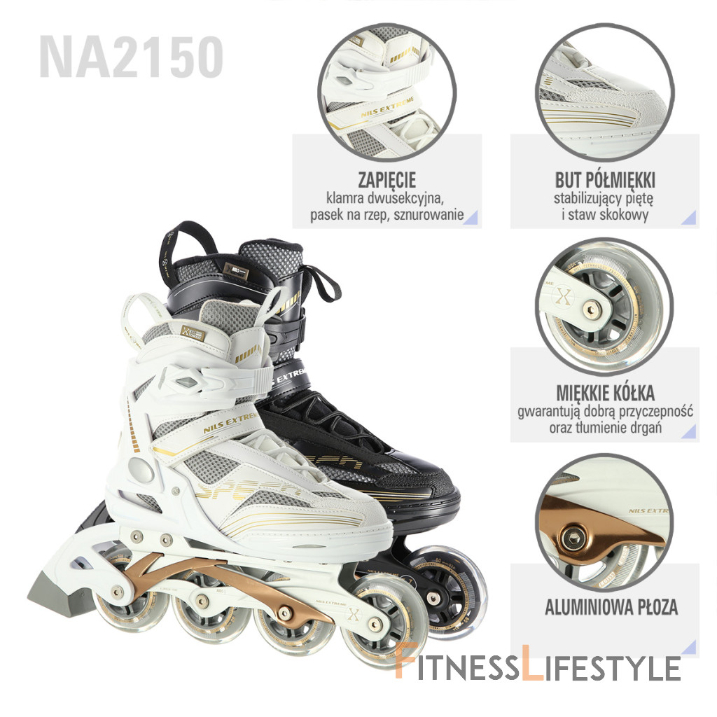 80-milimetrové kolieska s tvrdosťou 82A sú uložené v hliníkovej lište vyrobenej precíznou CNC technológiou, dobre priliehajú k podkladu a čiastočne pohlcujú nervnosti. Model NA2150 je osadený ložiskami ABEC 9 CHROME, ktoré sa vyznačujú nízkym odporom, kedy jazda má dobrú zotrvačnosť a na korčuliach tak možno dosiahnuť vysokú rýchlosť, alebo uraziť dlhšiu vzdialenosť bez vynaloženia zbytočnej sily.