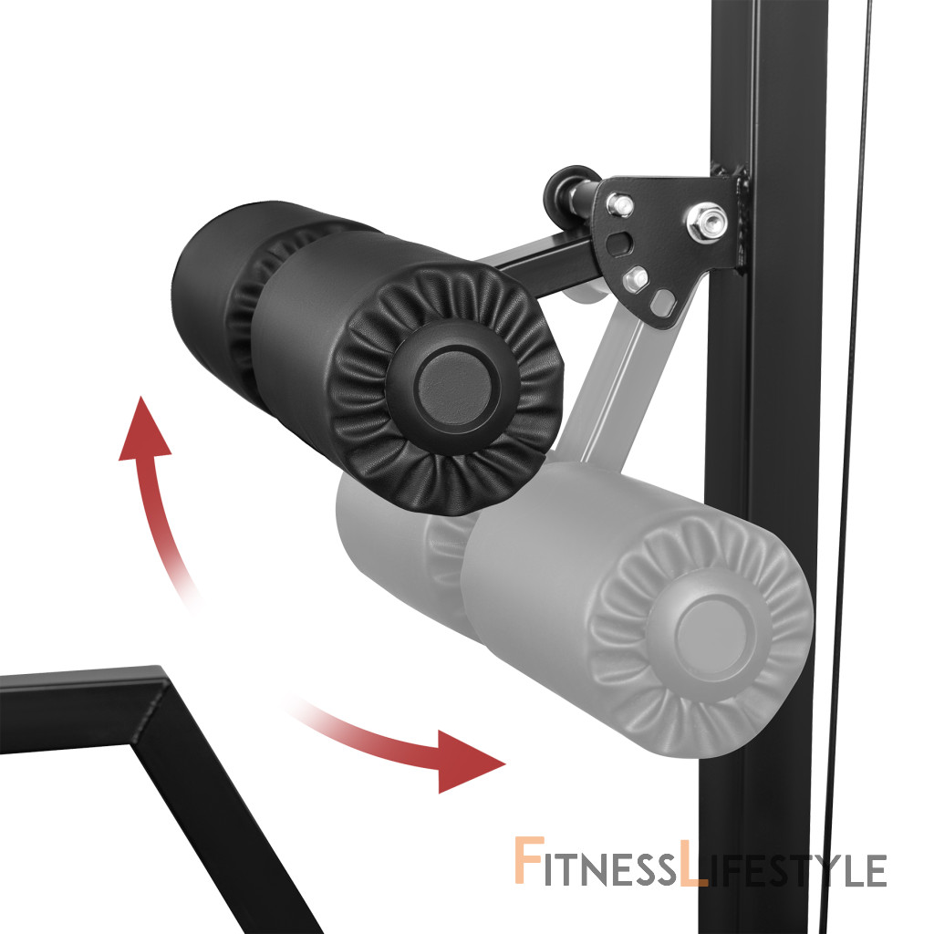 Regulácia prebieha na štyroch pozíciách. Zarážka stabilizuje telo pri práci na hornej kladke.