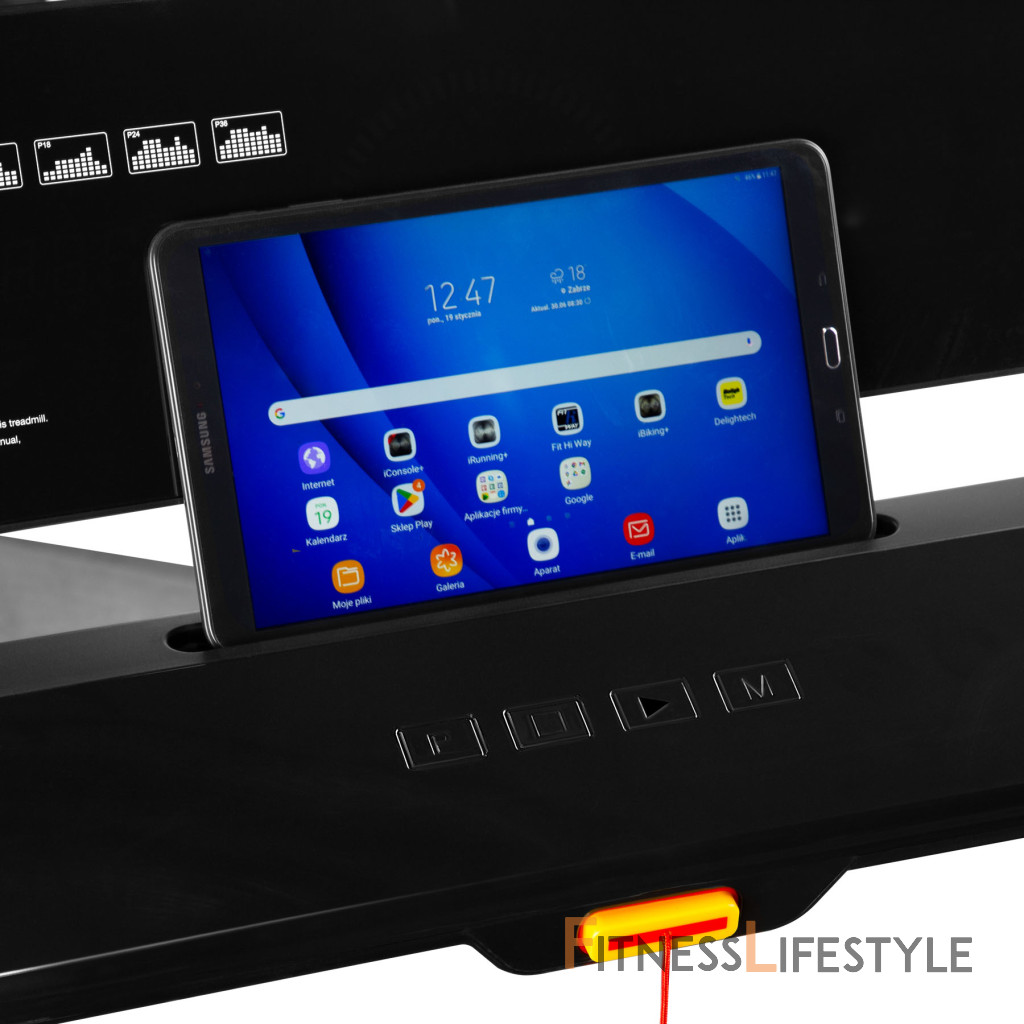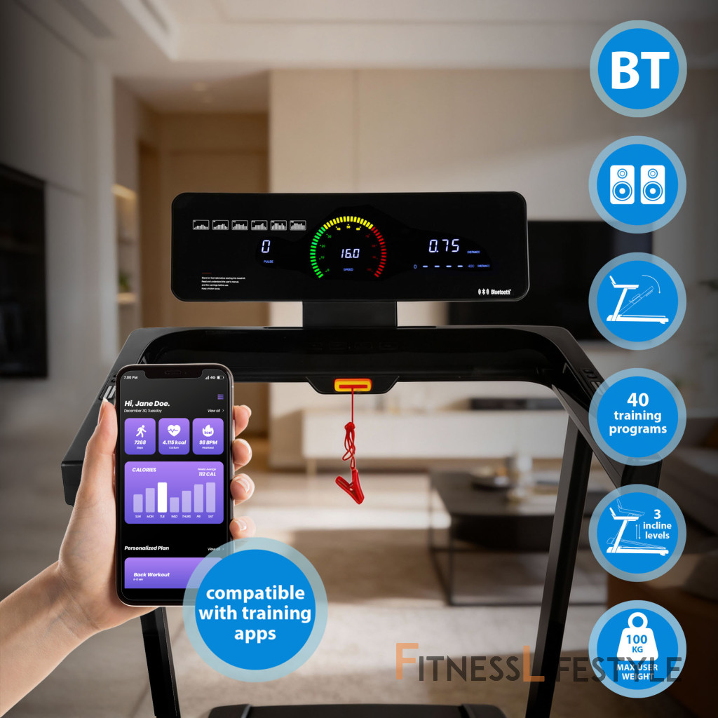 Integrovaný Bluetooth modul a dva vstavané reproduktory umožňujú prehrávanie hudby a zvukov z tréningových aplikácií. Držiak na tablet alebo telefón zaisťuje pohodlné používanie mobilných zariadení pri chôdzi a behu.