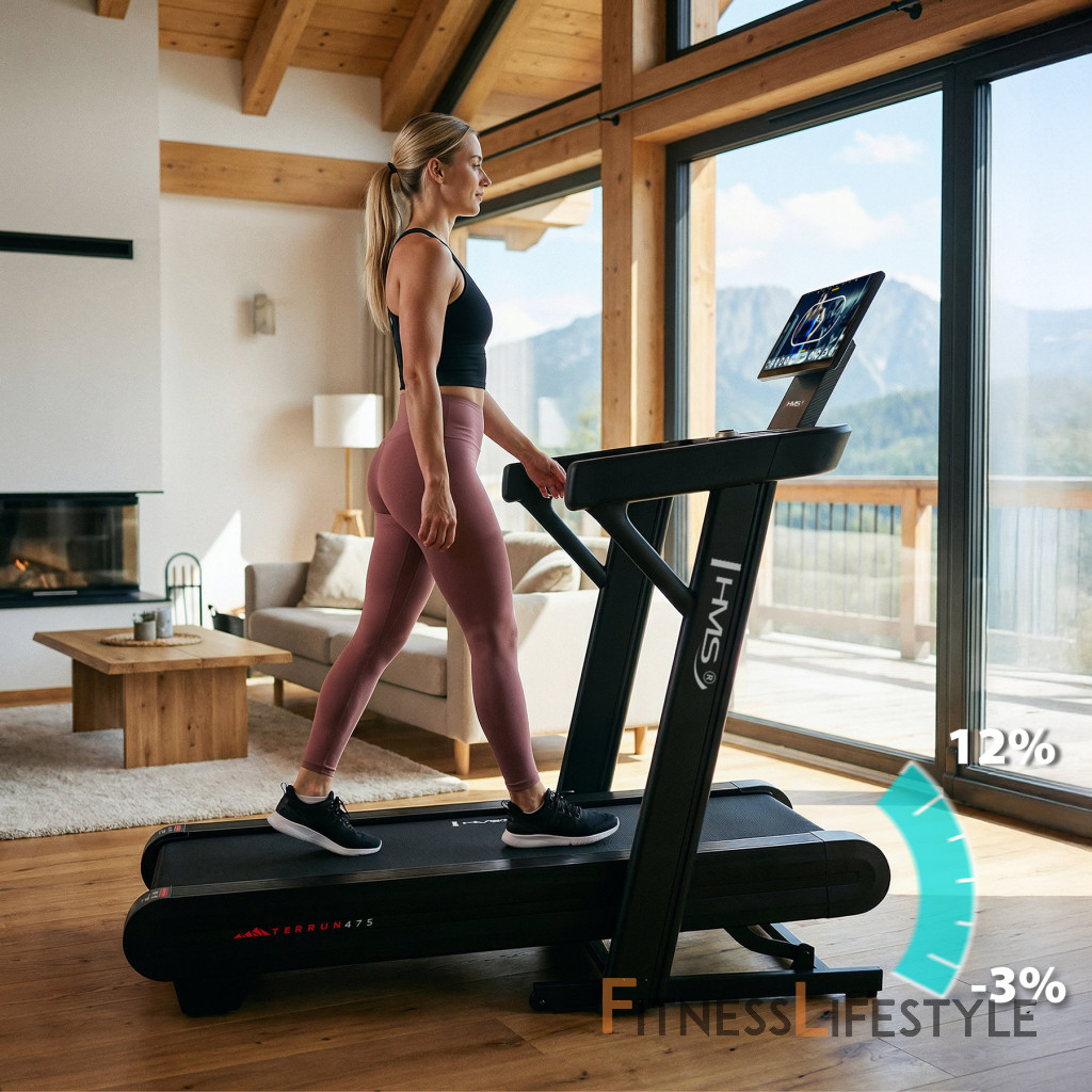Bežecký pás TERRUN475 disponuje obojsmerným sklonom v rozsahu od -3 % do 12 %, ktorý umožňuje realistickú simuláciu zbehov aj prudkých výbehov. Tréning tak pripomína beh v horách alebo na členitých lesných chodníkoch a intenzívne zapája svaly nôh, zadku aj stredu tela (core).