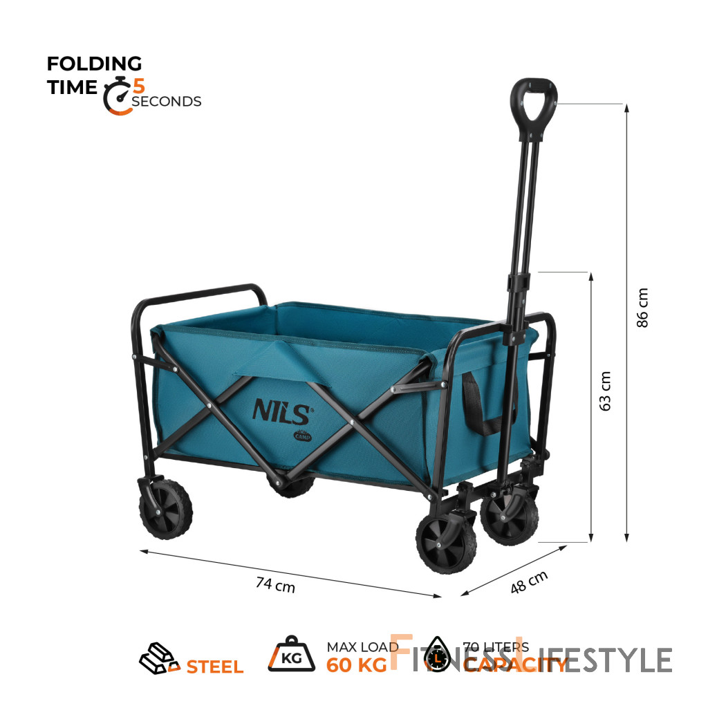 Vozík ponúka objem 70 litrov, takže poskytuje dostatok priestoru pre veci, ktoré je bežne ťažké prenášať naraz – napríklad deku, tašky, vybavenie na piknik, športové doplnky alebo zásoby na celý deň. Maximálna nosnosť až 60 kg umožňuje prepravu aj ťažších predmetov bez zbytočnej námahy.