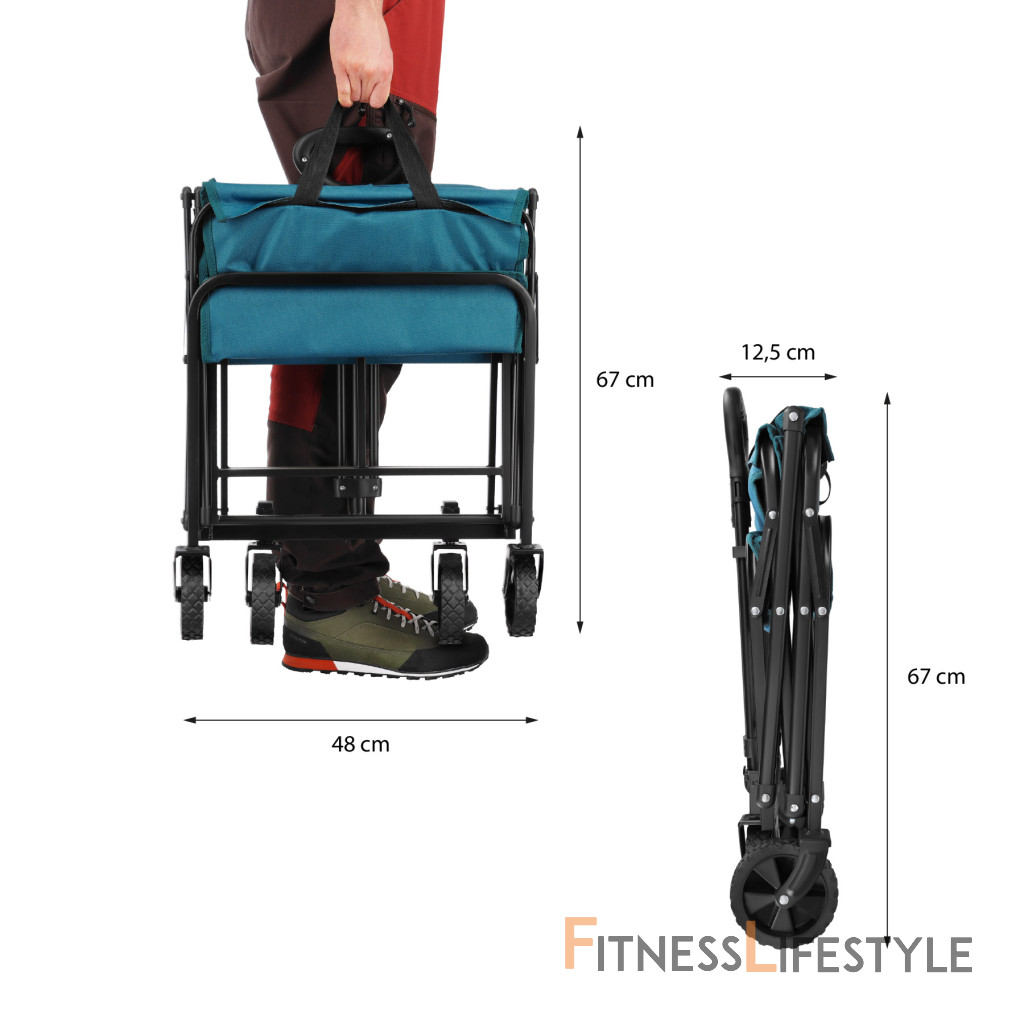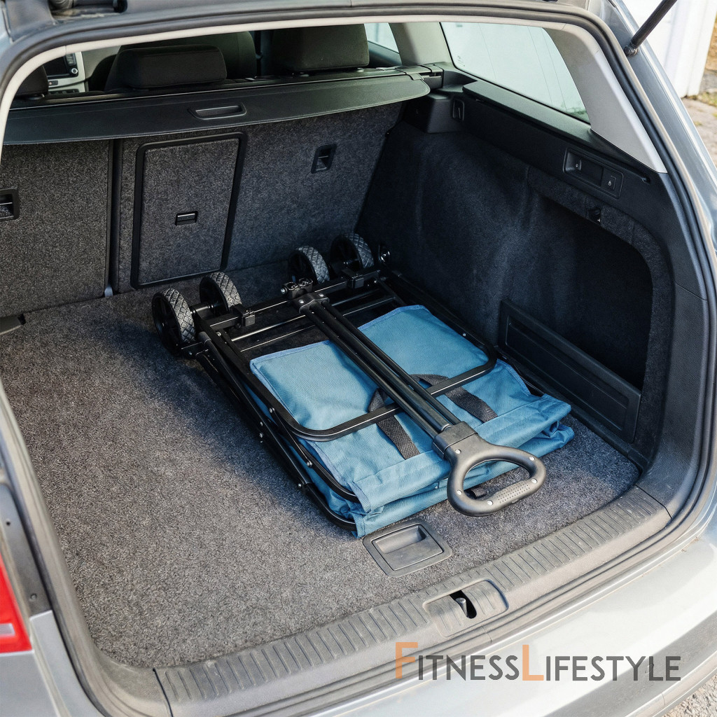 Veľkou výhodou je rýchly skladací systém a jednoduchá montáž. Vozík pripravíte na použitie v priebehu niekoľkých okamihov a po skončení ho rovnako rýchlo zložíte. V kompaktnom stave sa ľahko zmestí do kufra auta a doma zaberie minimum miesta, takže ho môžete mať vždy pripravený na ďalší výlet alebo náročný deň plný aktivít.
