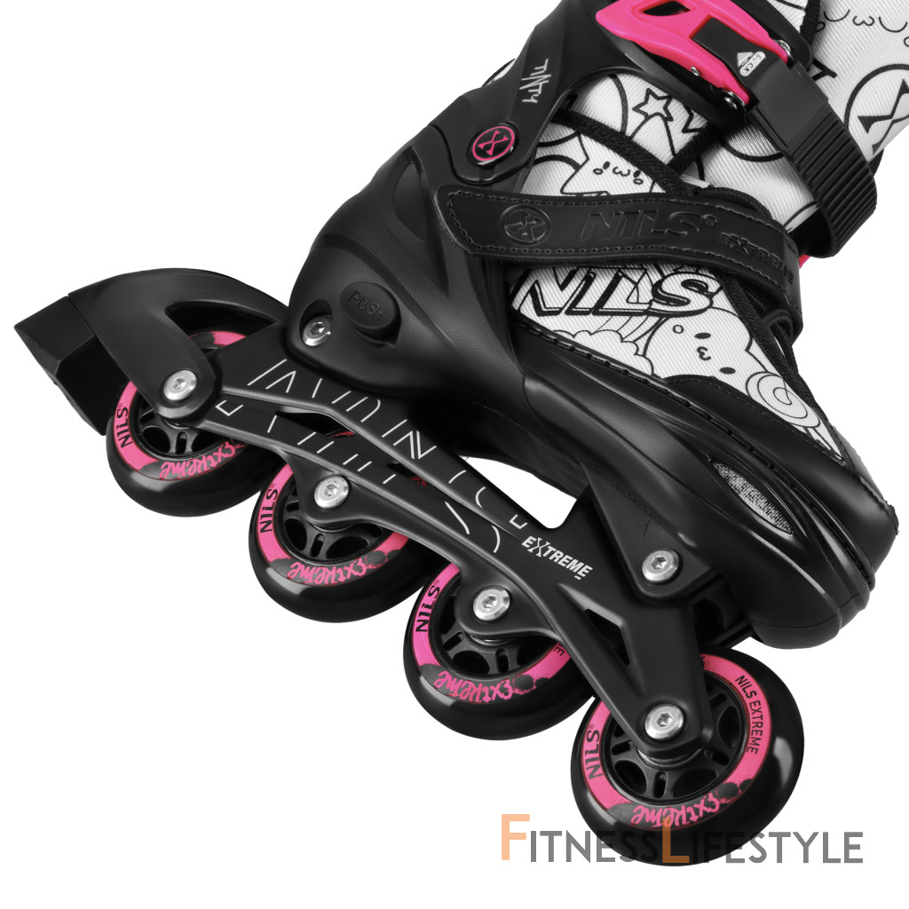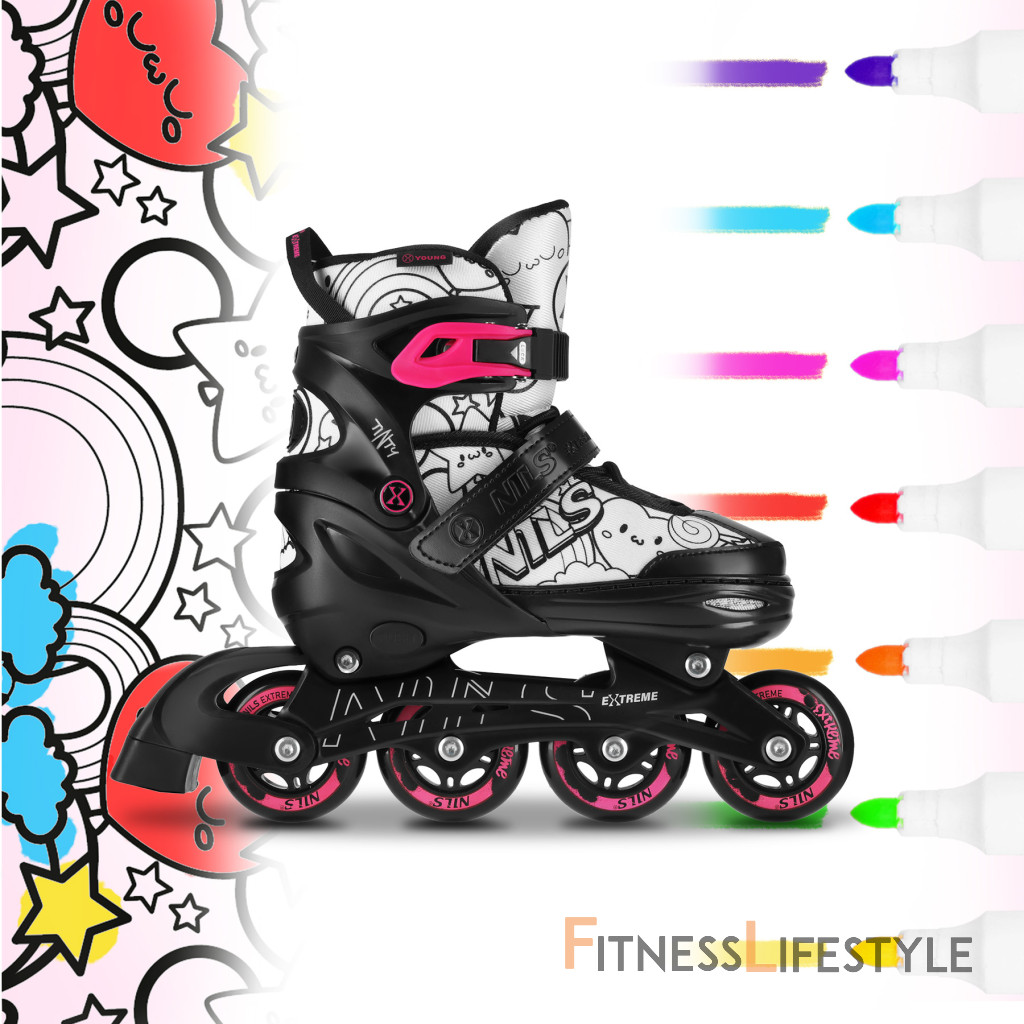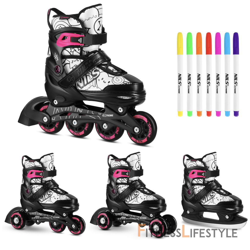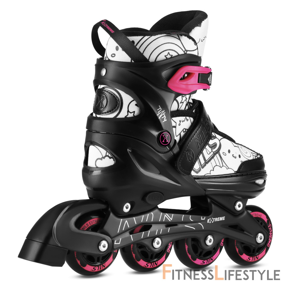 NH10907 TINTY NILS Extreme sú nastaviteľné detské korčule, ktoré umožňujú začať s korčuľovaním zábavnou a kreatívnou formou. Model ponúka praktickú funkciu 4v1, vďaka ktorej je možné jeden set používať ako ľadové korčule, inline korčule, klasické kolieskové korčule (quad) alebo 2+2. Vďaka tomu je možné vybavenie ľahko prispôsobiť úrovni dieťaťa aj preferovanému štýlu jazdy.