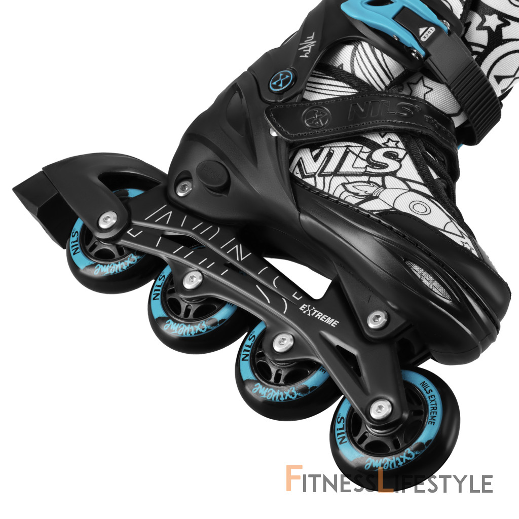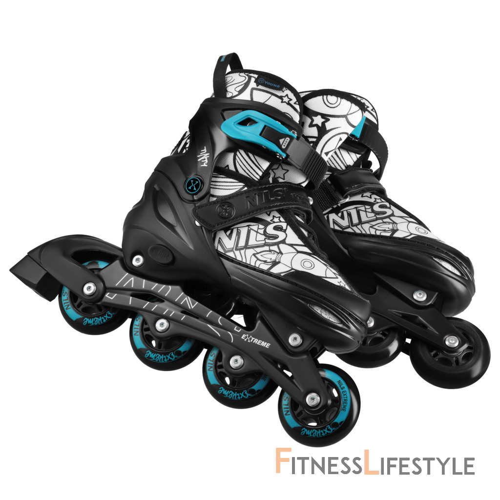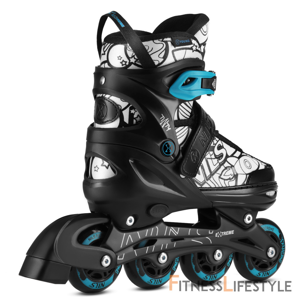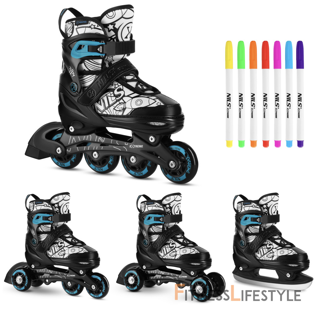 NH10907 TINTY NILS Extreme sú nastaviteľné detské korčule, ktoré umožňujú začať s korčuľovaním zábavnou a kreatívnou formou. Model ponúka praktickú funkciu 4v1, vďaka ktorej je možné jeden set používať ako ľadové korčule, inline korčule, klasické kolieskové korčule (quad) alebo 2+2. Vďaka tomu je možné vybavenie ľahko prispôsobiť úrovni dieťaťa aj preferovanému štýlu jazdy.