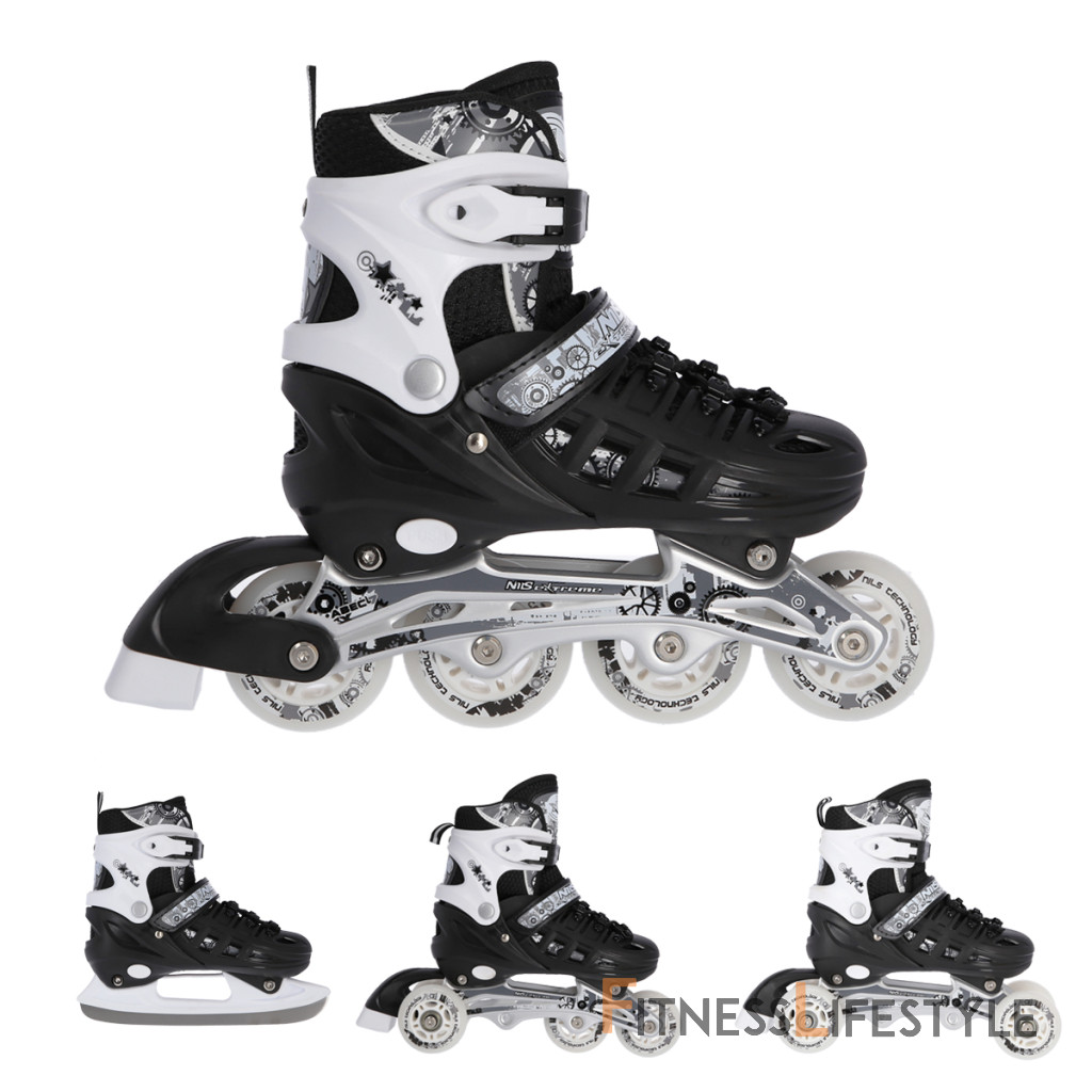 Skates nils extrémne NH10905 sú multifunkčný model, ktorý ponúka 4 možnosti zostavy podvozku-ako ľadové korčule, in-line korčule, tanečné korčule a pre najmenšiu kombináciu noža LED 2+1+1+. V dôsledku toho je to univerzálne riešenie, ktoré sa prispôsobuje veku a zručnostiam používateľa a poskytne jazdu počas celého roka.