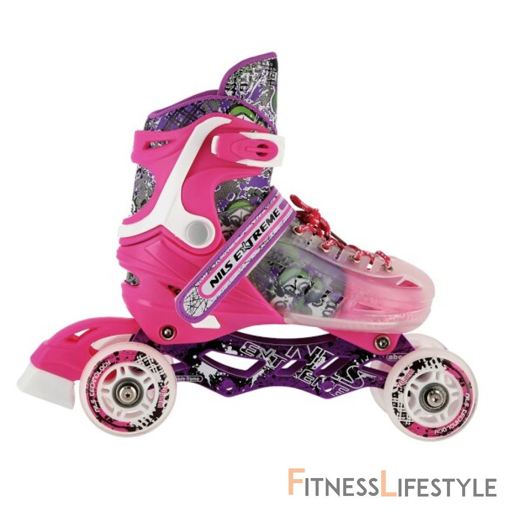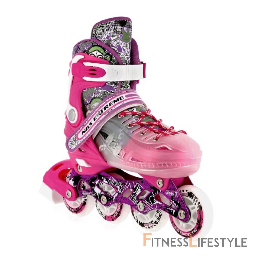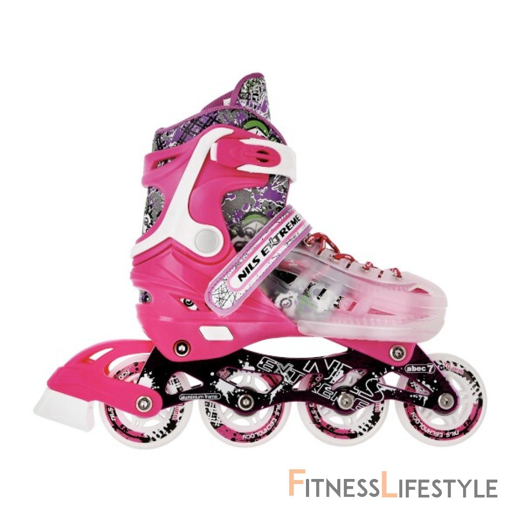 Rastúce kolieskové korčule NILS EXTREME NH18122 s variabilným zostavením podvozku a vymeniteľným nožom na ľad sú vhodné k rekreačnej jazde. Výhodou je zmena veľkosti stlačením jediného tlačidla. Priesvitná, predná časť tvrdé topánky dáva vyniknúť modernému dizajnu vnútornej vložky. Zapínanie je riešené klasickou troj-kombináciou (šnurovanie, opasok na suchý zips, dvousekční pracka). Kolieska sú osadené ložiskami ABEC 7 pre rýchlu jazdu, korčule sú tak vhodné pre zdatnejších jazdcov. Variabilné podvozok umožnuje zostavenie ako In-ine, Quad (tanečné), ľadový, alebo sa zadnými kolieskami vedľa seba pre začiatočníkov, tieto variácie zaručujú využitie korčulí po celý rok.