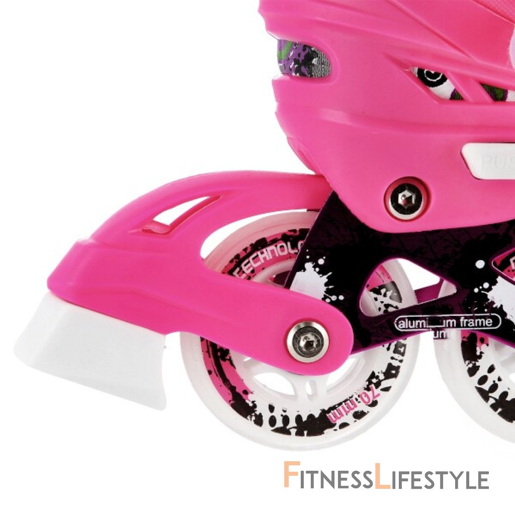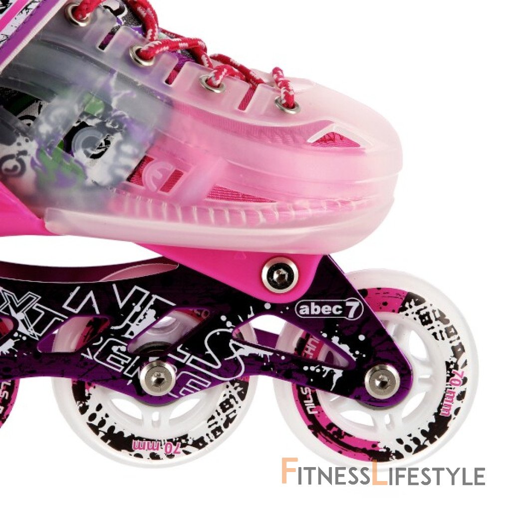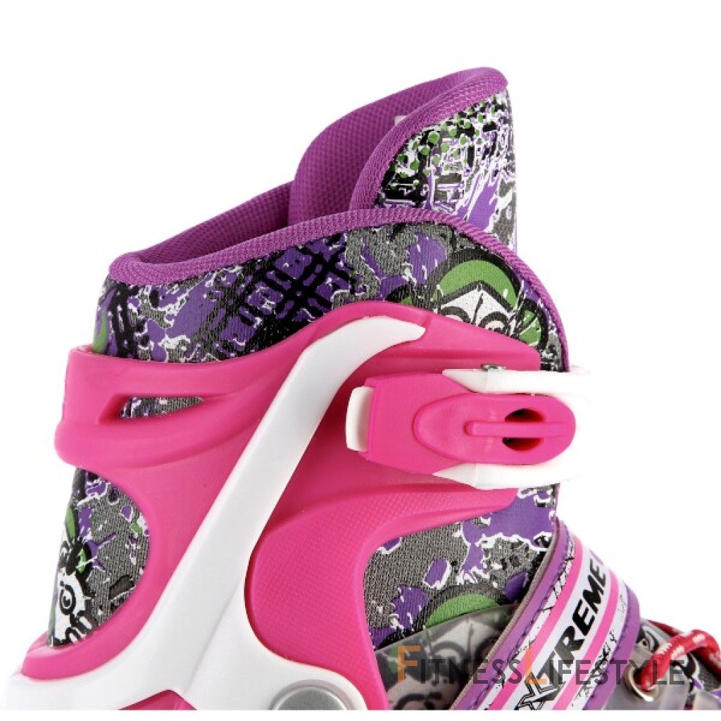 Rastúce kolieskové korčule NILS EXTREME NH18122 s variabilným zostavením podvozku a vymeniteľným nožom na ľad sú vhodné k rekreačnej jazde. Výhodou je zmena veľkosti stlačením jediného tlačidla. Priesvitná, predná časť tvrdé topánky dáva vyniknúť modernému dizajnu vnútornej vložky. Zapínanie je riešené klasickou troj-kombináciou (šnurovanie, opasok na suchý zips, dvousekční pracka). Kolieska sú osadené ložiskami ABEC 7 pre rýchlu jazdu, korčule sú tak vhodné pre zdatnejších jazdcov. Variabilné podvozok umožnuje zostavenie ako In-ine, Quad (tanečné), ľadový, alebo sa zadnými kolieskami vedľa seba pre začiatočníkov, tieto variácie zaručujú využitie korčulí po celý rok.