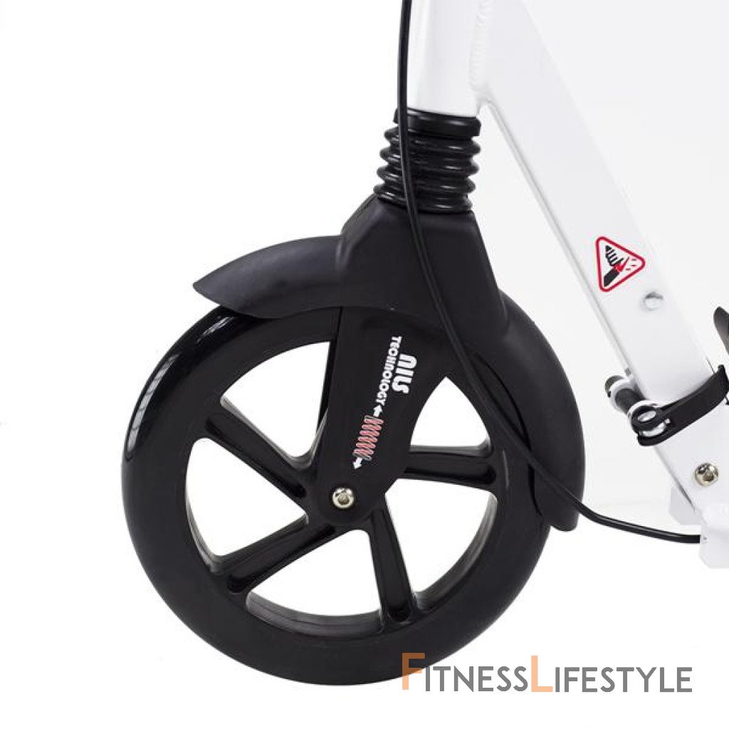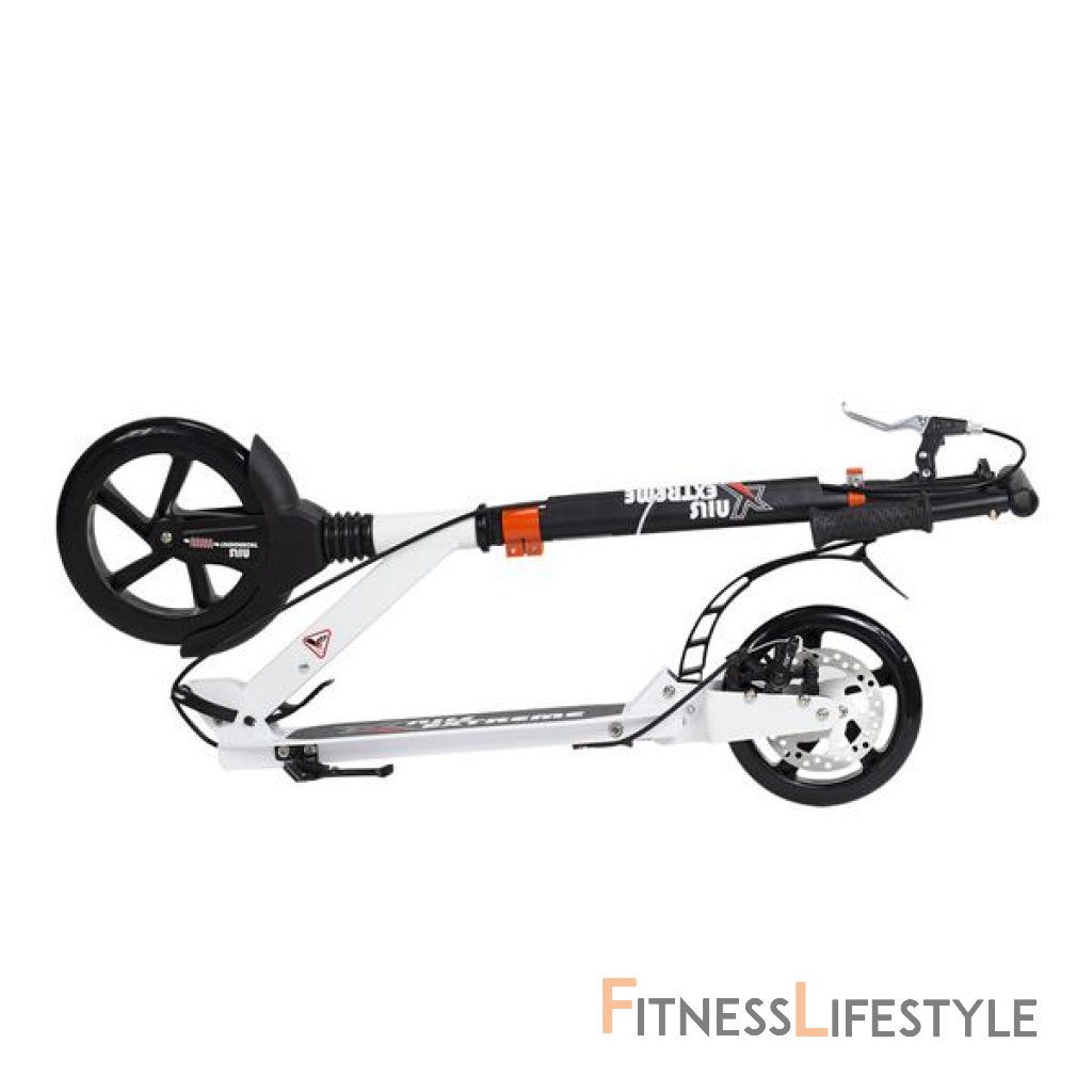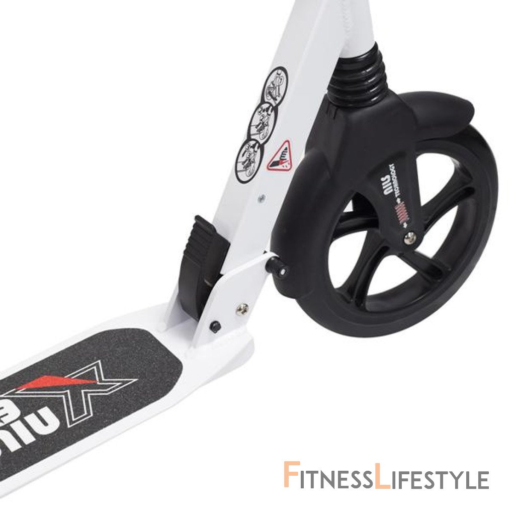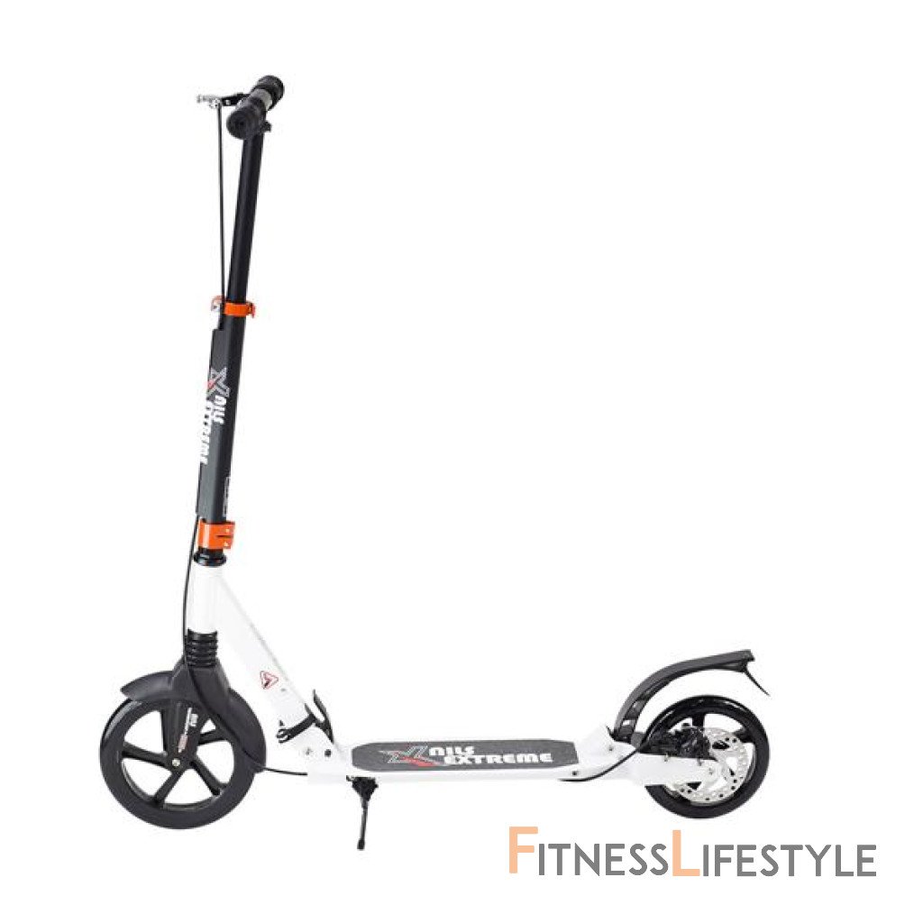 Skladacia kolobežka značky NILS EXTREME HA230T je kolobežka určená pre celú rodinu. Charakteristickou vlastnosťou kolobežky sú dva tlmiče - predné zvislý a zadné vodorovný, zaisťujúci väčší komfort počas jazdy, minimalizujú drncání a pohlcujú otrasy. Vďaka tomu sa produkt dobre osvedčí pri prechádzaní nerovných povrchov. Široký a dlhý nášľap je pokrytý protišmykovým gripom zaisťujúcim správnu priľnavosť topánky. Nastaviteľná riadidlá (až do výšky 106 cm) umožňujú prispôsobiť kolobežku k výške dieťaťa alebo tiež zaisťujú pohodlnú jazdu dospelým osobám. Mimo to má kolobežka 2 rozdielne veľkosti koliesok a to predné 230 mm a zadné 200 mm.