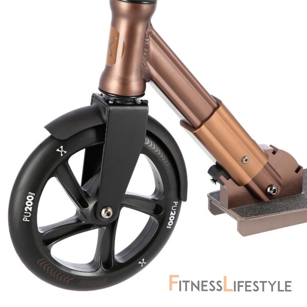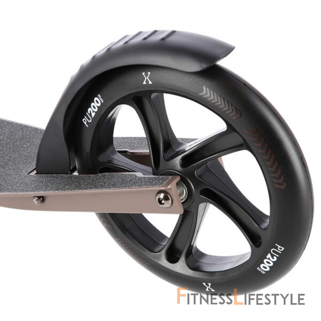 Zadný blatník slúži ako prítlačná brzda. Široká riadidlá sú opatrené gumovými rukoväťami, ktoré zaisťujú pevný a pohodlný úchop. 200 milimetrov veľké kolesá sú osadené ložiskami ABEC 9. Táto kombinácia zabezpečuje rýchlu, plynulú a bezpečnú jazdu. Blatník na prednom kolese a skladacie stojanček sú drobnosťami, ktoré přizpívají k maximálnemu možnému komfortu z jazdy a k celkovej radosti zo samotného použivania modelu MH205.