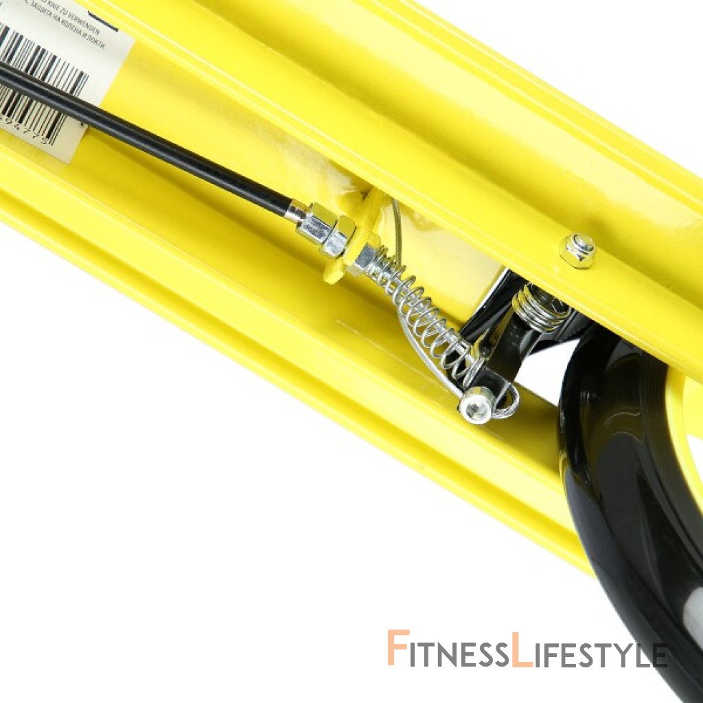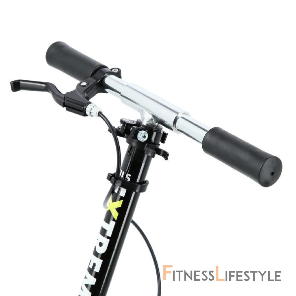 Zadný blatník slúži ako nožný, prítlačná brzda, pod blatníkom sa skrýva samostatná, malá brzda, ktorá je ovládaná páčkou z riadidiel. Riadidlá sú opatrené gumovými rukoväťami, ktoré zaisťujú pevný a pohodlný úchop. Veľké kolesá sú osadené ložiskami ABEC 7. Táto kombinácia zabezpečuje plynulú a bezpečnú jazdu. Na ľavej strane nášľapu sa nachádza sklopný stojan.
