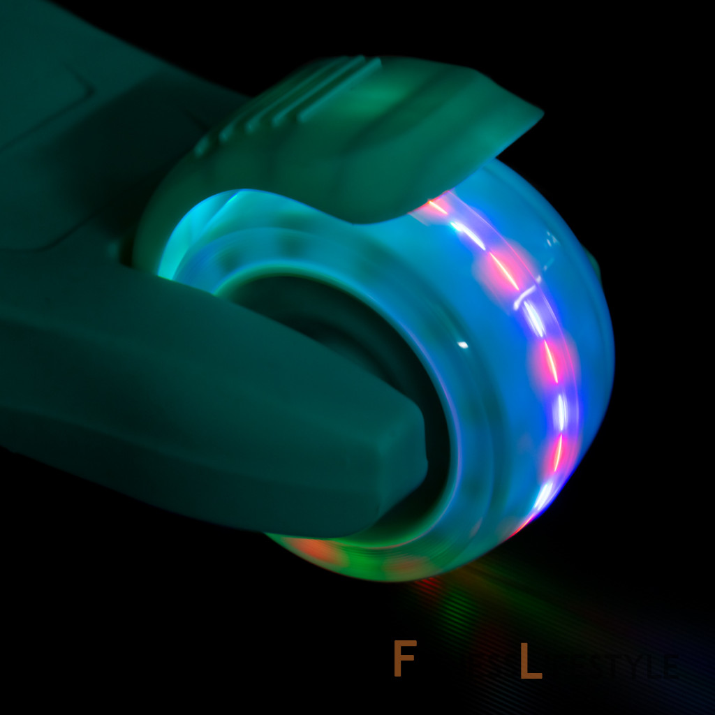 Všetky kolieska v sebe majú ukryté LED diódy, ktoré sa pri pohybe rozsvieti, široké zdaní koliesko zvyšuje stabilitu kolobežky. Riadidlá je možné výškovo nastaviť v rozmedzí 63 - 80 centimetrov.
