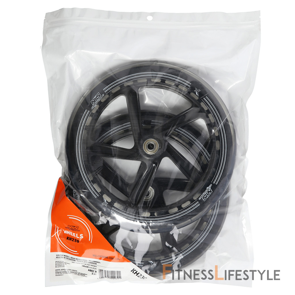 Náhradné kolieska pre kolobežky KH230 vyrobené z polyuretánu alebo ak je vo skratke PU. Najdôležitejšie parametre tohto typu kolies sú ich priemer a tvrdosť. Priemer kolies má priamy vplyv na rýchlosť jazdy a manévrovateľnosť. Na druhej strane tvrdosť určuje jazdný komfort a priľnavosť k zemi, na ktorej sa pohybujeme. Súčasťou balenia sú aj ložiská ABEC 9.