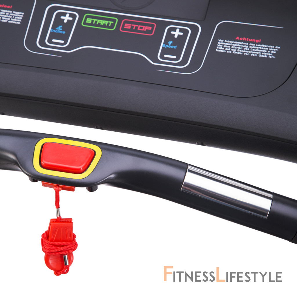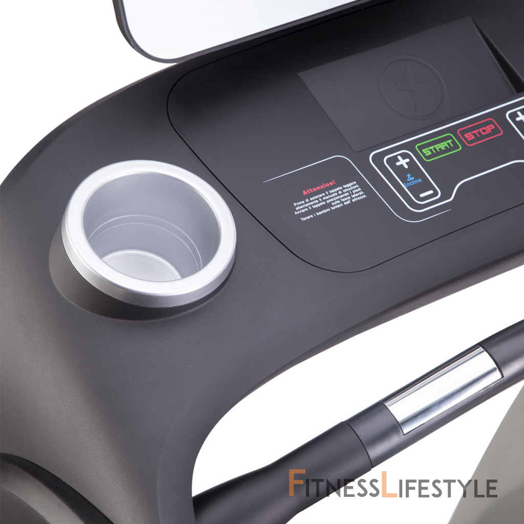 Veľká a prehľadná ovládacia konzola je vybavená bezpečnostnou poistkou, ktorá zastaví pás v prípade pádu, madlami na meranie tepovej frekvencie a dvoma otvormi napríklad na fľašu s vodou.