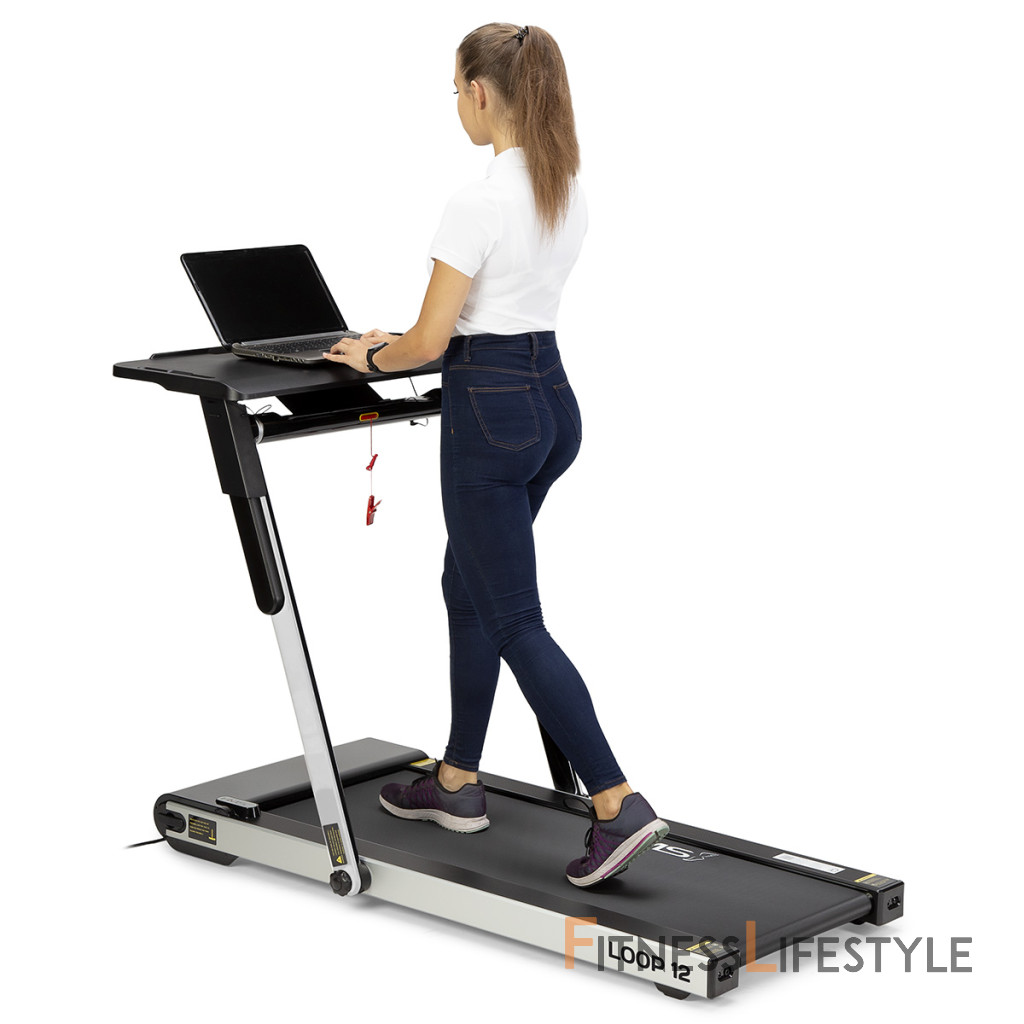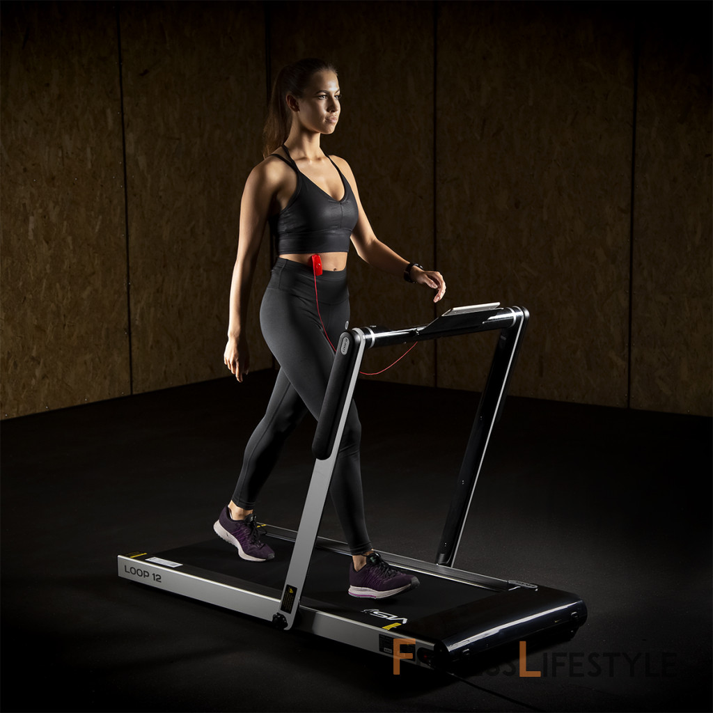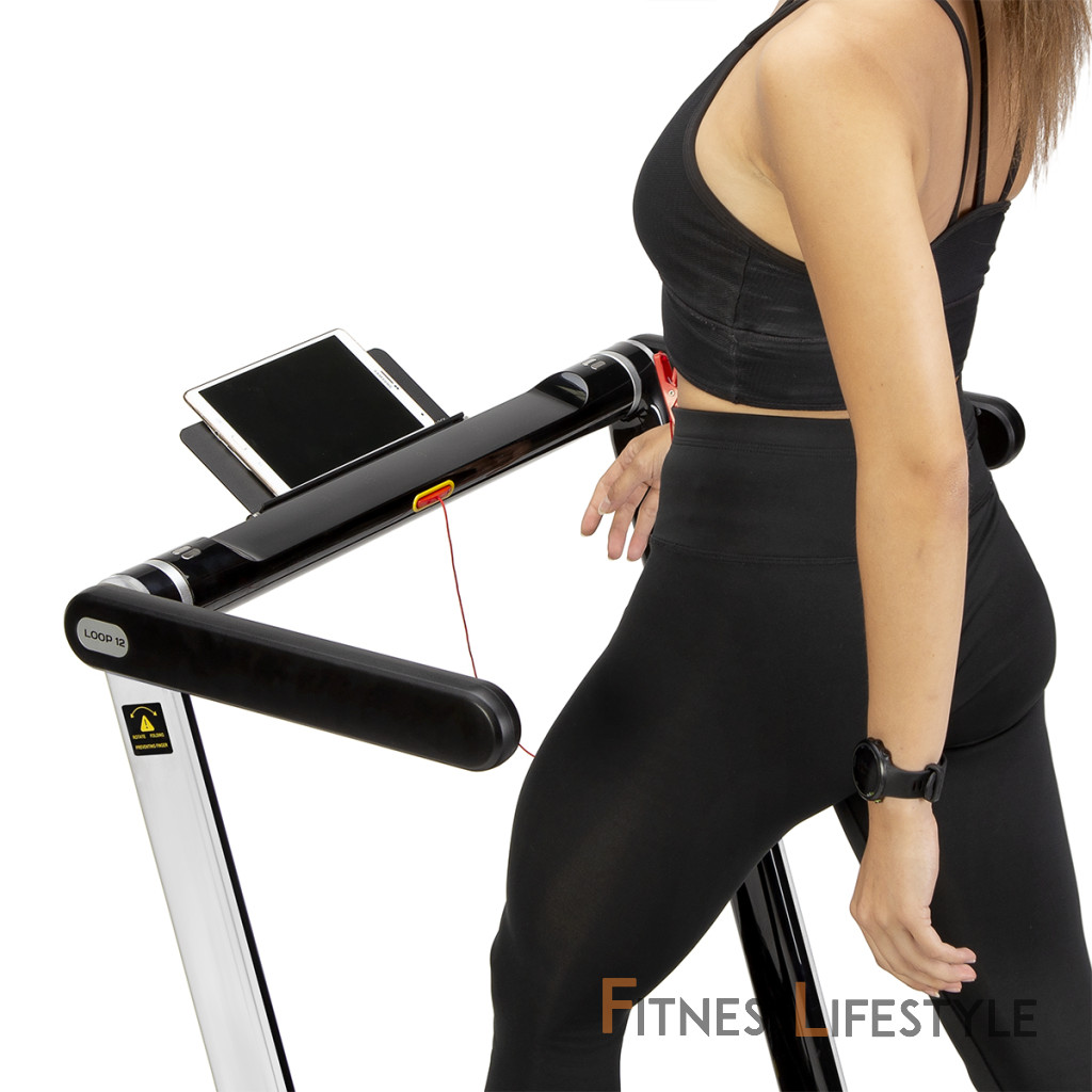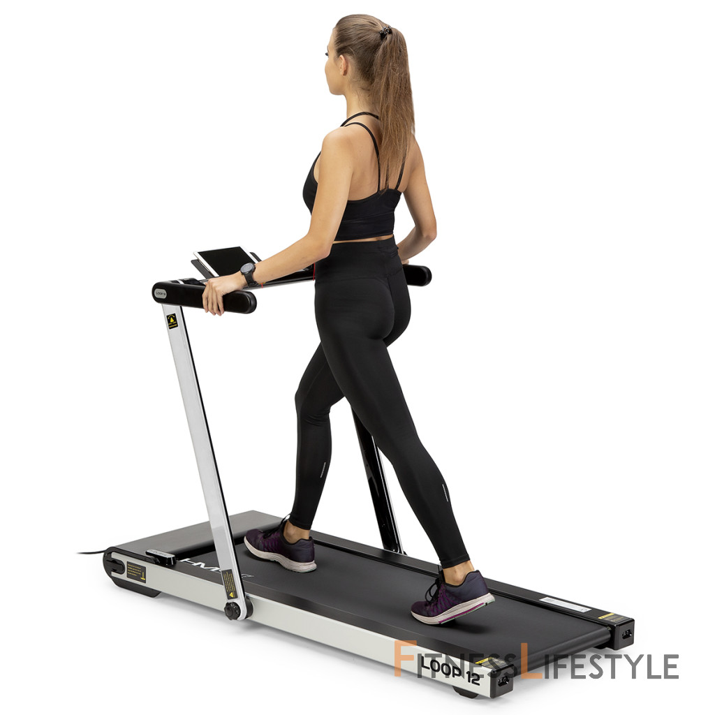 Bez nasadeného pultu sa z trenažéra LOOP12 stáva plnohodnotný bežecký pás s maximálnou rýchlosťou 12 km/ha výkonom 2,5 HP. Bežecká plocha s rozmermi 125 x 45 cm je na 6 miestach odpružená pomocou silikagelových silentblokov, ktoré znižujú zaťažovanie kĺbov pri behu. Konzola sa dá ľahko sklopiť k zadnej hrane trenažéra a po sklopení získame rozmer 158 x 77 x 14 cm a trenažér sa tak zmestí za skriňu, alebo pod posteľ. Presúvanie modelu LOOP12 navyše uľahčujú 2 páry koliesok. Prvý pár sa nachádza na spodnej hrane a po zdvihnutí zadnej časti pásu umožňujú pohyb vpred a vzad. Druhý pár koliesok sa nachádza na čele trenažéra a po jeho zdvihnutí do kolmej pozície umožňujú pohyb do strán.
