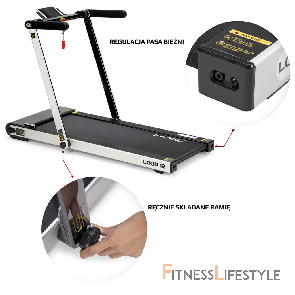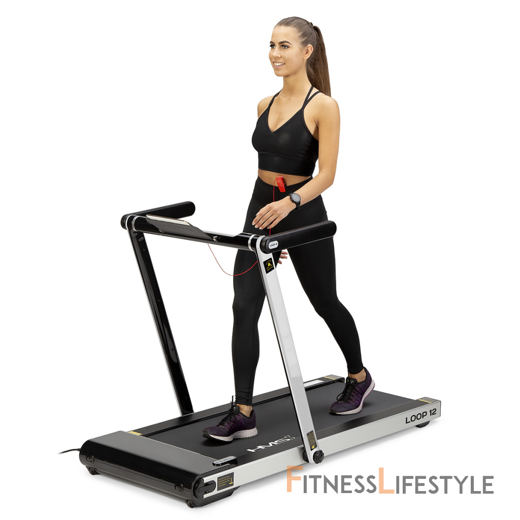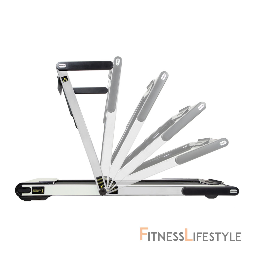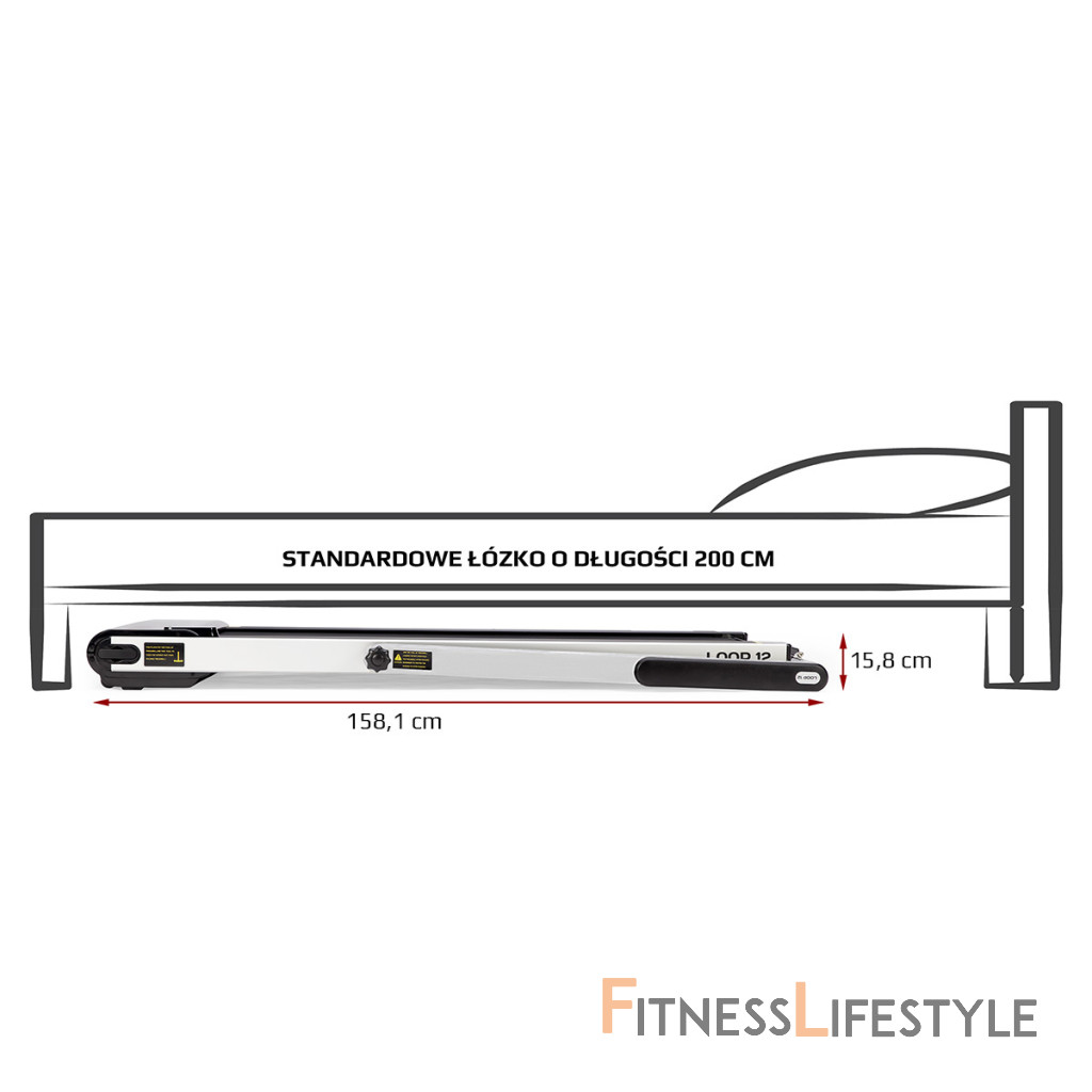 Bez nasadeného pultu sa z trenažéra LOOP12 stáva plnohodnotný bežecký pás s maximálnou rýchlosťou 12 km/ha výkonom 2,5 HP. Bežecká plocha s rozmermi 125 x 45 cm je na 6 miestach odpružená pomocou silikagelových silentblokov, ktoré znižujú zaťažovanie kĺbov pri behu. Konzola sa dá ľahko sklopiť k zadnej hrane trenažéra a po sklopení získame rozmer 158 x 77 x 14 cm a trenažér sa tak zmestí za skriňu, alebo pod posteľ. Presúvanie modelu LOOP12 navyše uľahčujú 2 páry koliesok. Prvý pár sa nachádza na spodnej hrane a po zdvihnutí zadnej časti pásu umožňujú pohyb vpred a vzad. Druhý pár koliesok sa nachádza na čele trenažéra a po jeho zdvihnutí do kolmej pozície umožňujú pohyb do strán.