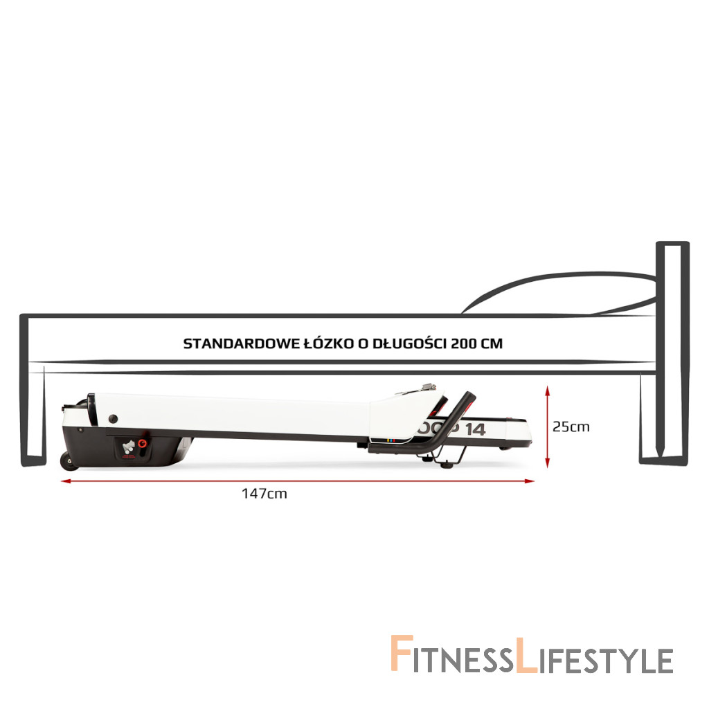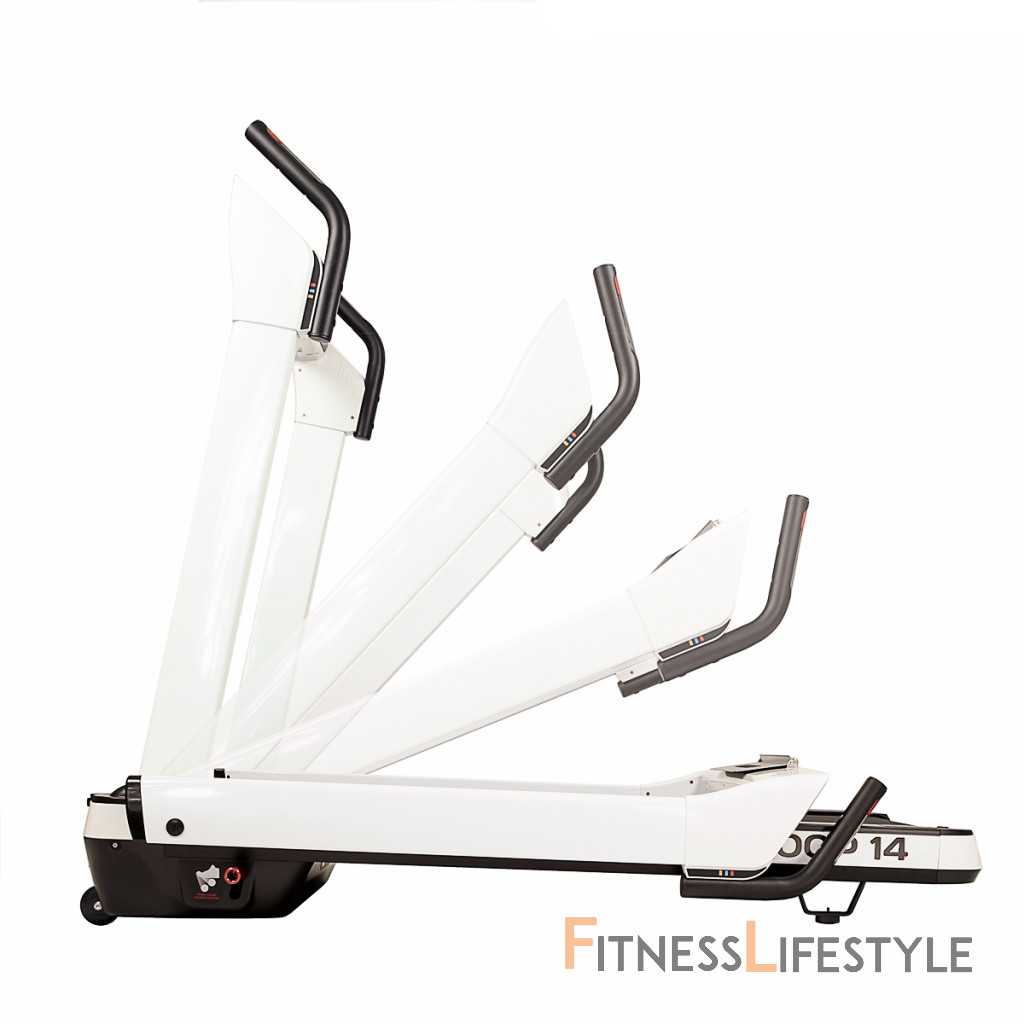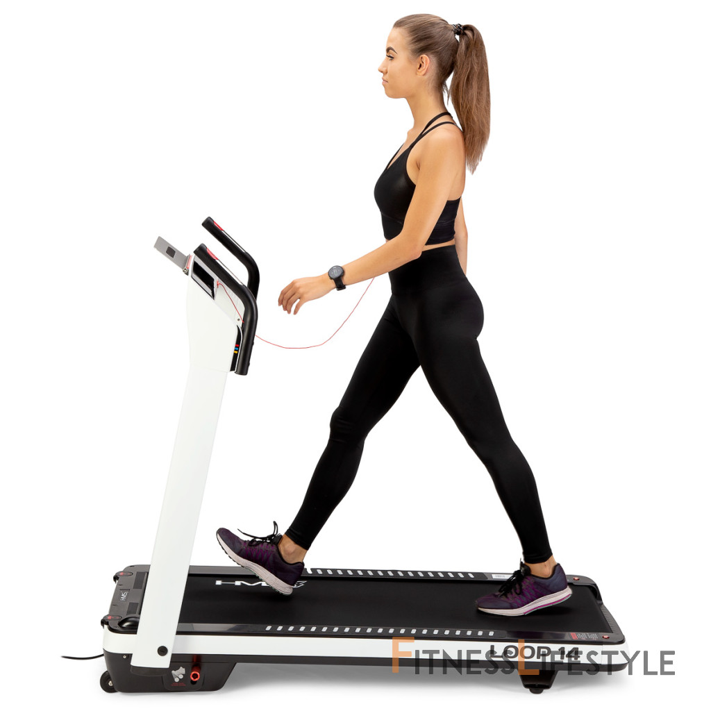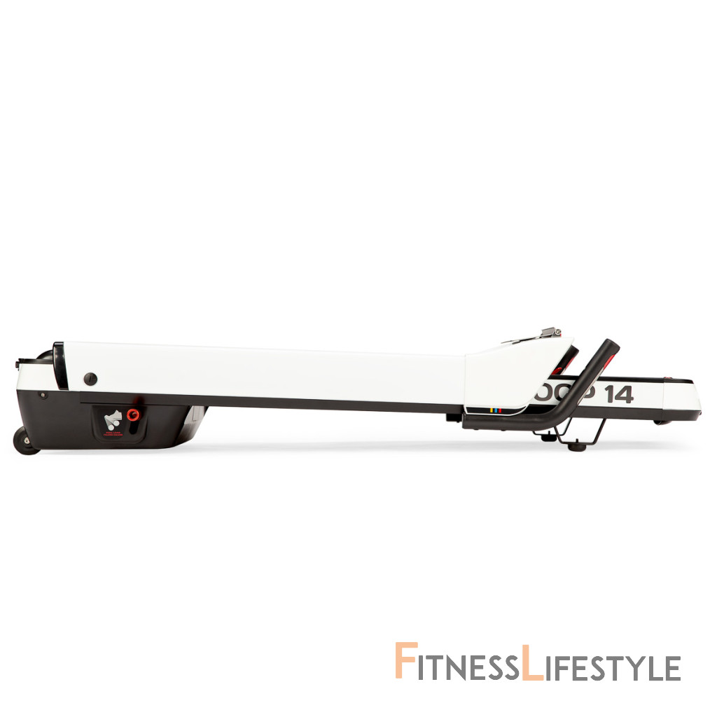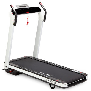 Trenažér je vybavený motorom s výkonom 2,5 HP, ktorý dokáže rozpohybovať behúň na maximálnu rýchlosť 14 km/h. LOOP14 taktiež disponuje automatickou reguláciou sklonu v rozsahu 0 - 12 ° pre simuláciu behu v teréne. Bežecká plocha s rozmermi 130 x 48 cm je na 6 miestach odpružená pomocou silikagelových silentblokov, ktoré znižujú zaťažovanie kĺbov pri behu. Konzola ide pomocou nášľapnej poistky ľahko sklopiť k zadnej hrane trenažéra a po sklopení získame rozmer 146 x 75 x 27 cm a trenažér sa tak zmestí za skriňu, alebo pod posteľ. Presúvanie modelu LOOP14 navyše uľahčujú 2 páry koliesok. Prvý pár sa nachádza na spodnej hrane a po zdvihnutí zadnej časti pásu umožňujú pohyb vpred a vzad. Druhý pár koliesok sa nachádza na čele trenažéra a po jeho zdvihnutí do kolmej pozície umožňujú pohyb do strán.